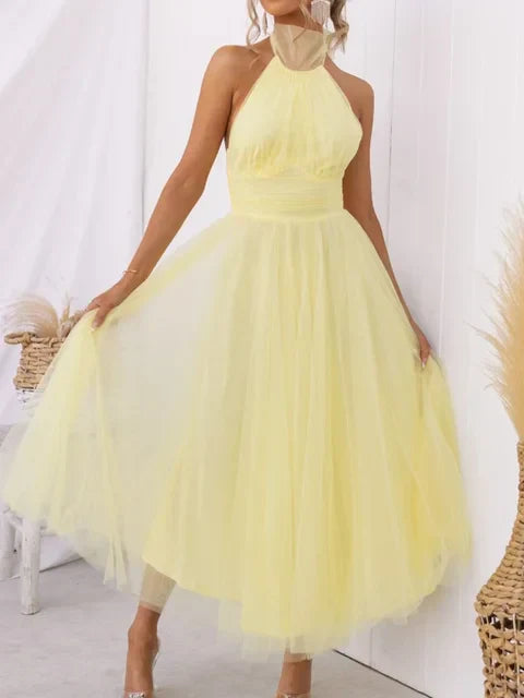 1* Sleeveless halterneck dress in solid colour mesh fabric with stand-up collar