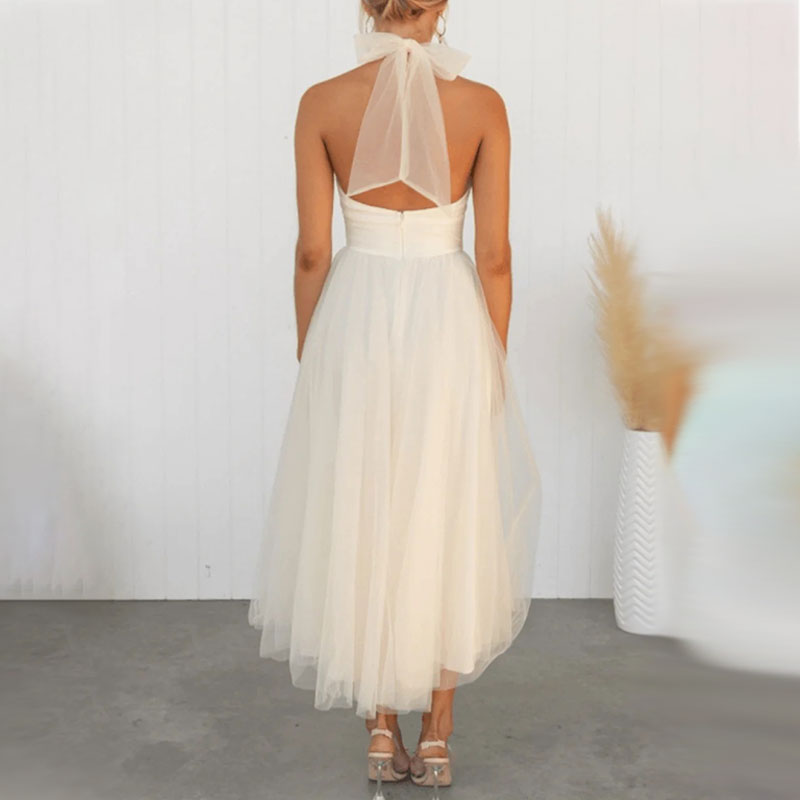 Type: Sleeveless halterneck dress in solid-coloured mesh fabric with stand-up collar
