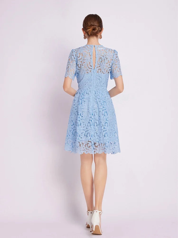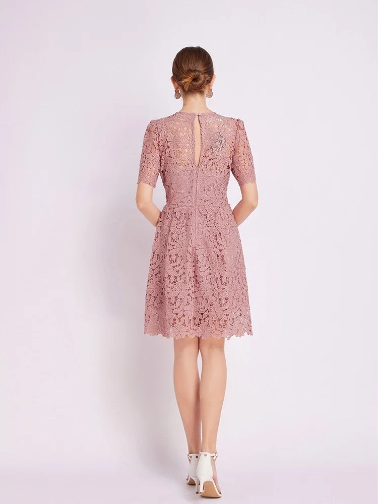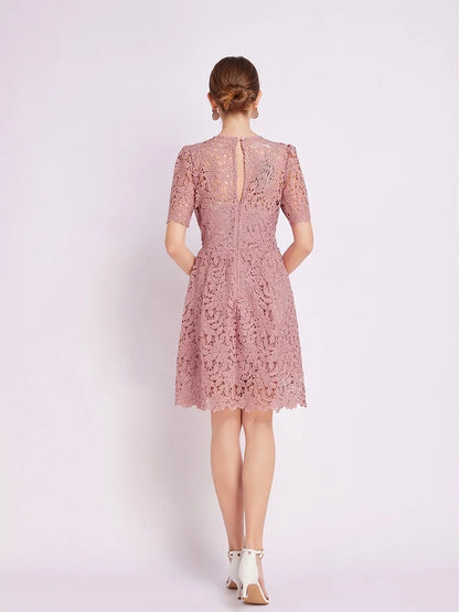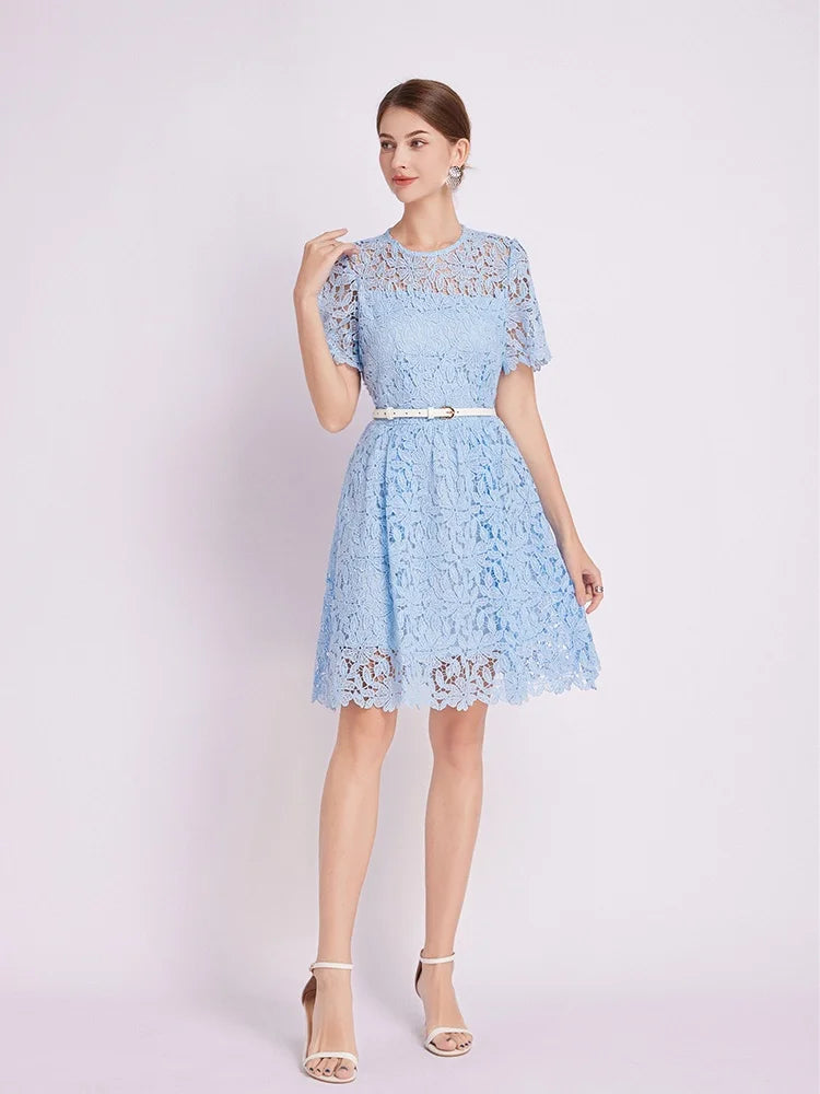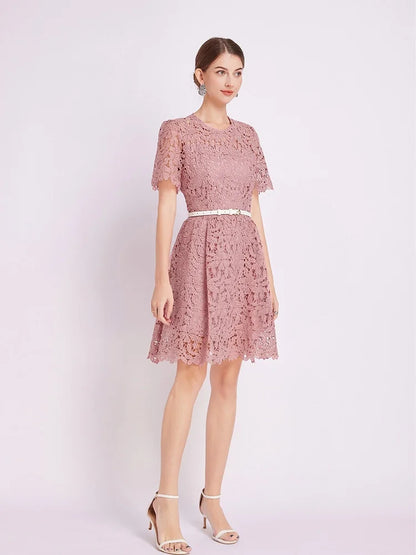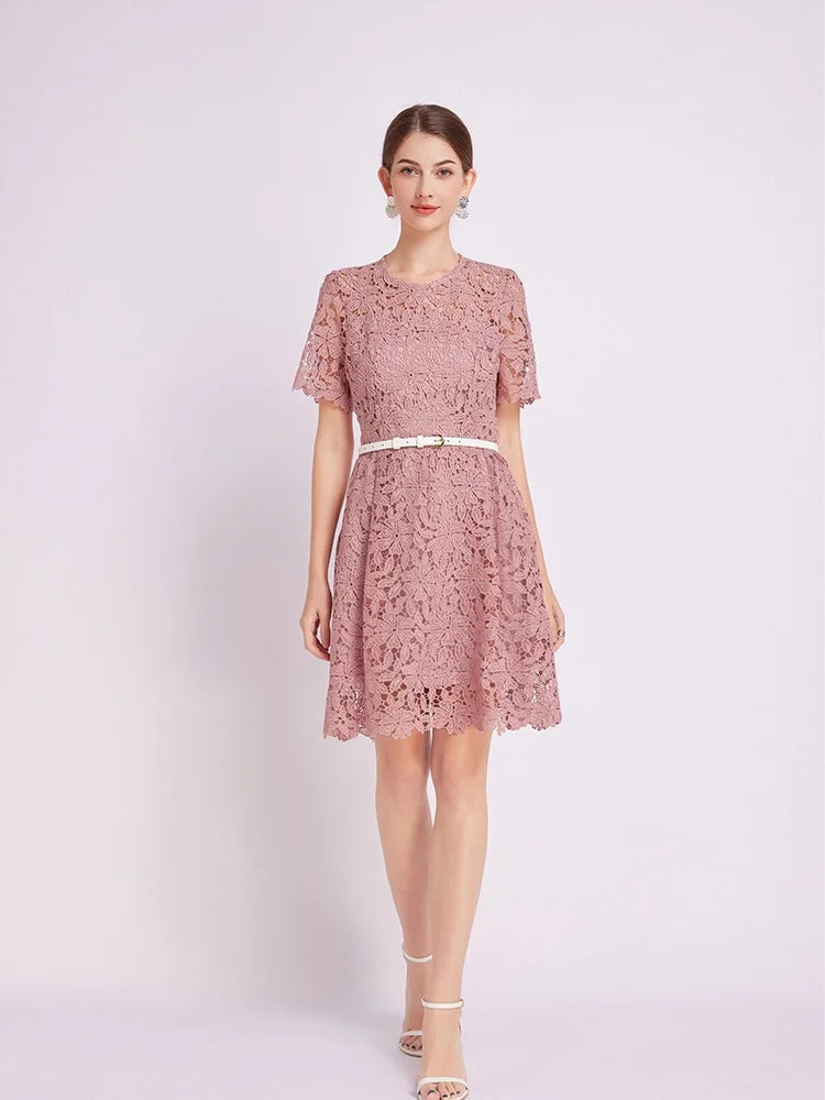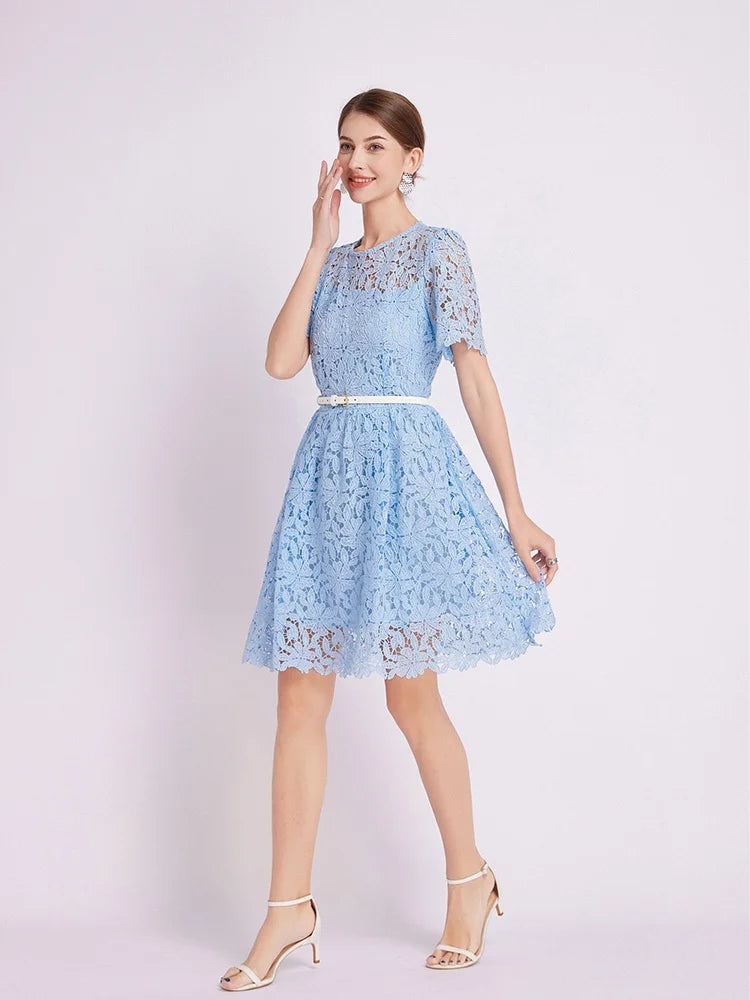 Step into sophistication with Jessica’s Serene Lace Dress, featuring an exquisite lace hollow-out design and a stylish belted waist. With its short sleeves and classic O-neck, this dress brings high-end elegance to any warm-weather event.