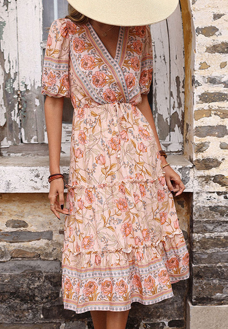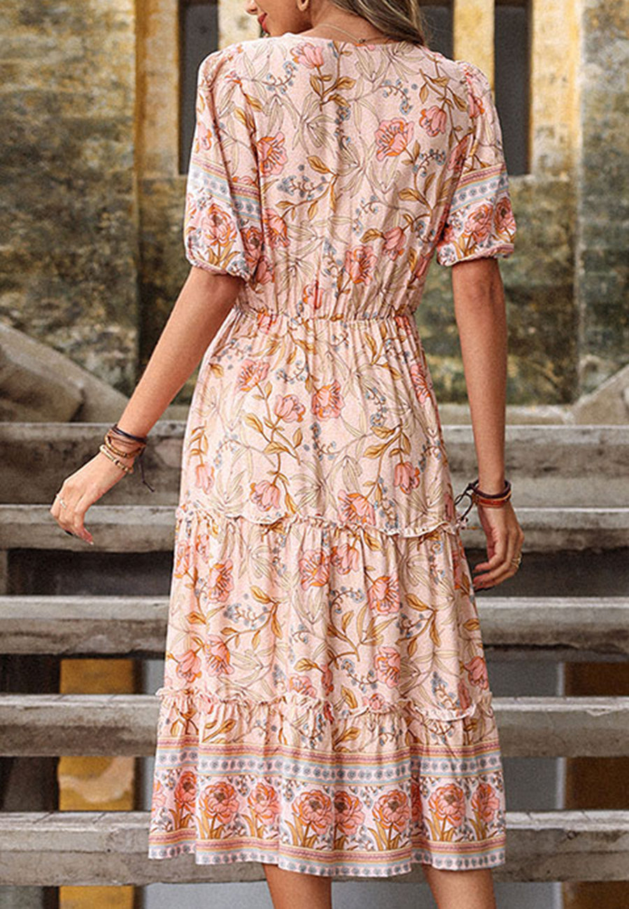 Vibemartini dress is detailed with gorgeous floral boho prints. Features a surplice neckline. puff sleeves. tiered skirt with ruffle details. A-line silhouette. and below knee length. Pair it with a straw bag and espadrilles for a fabulous look.