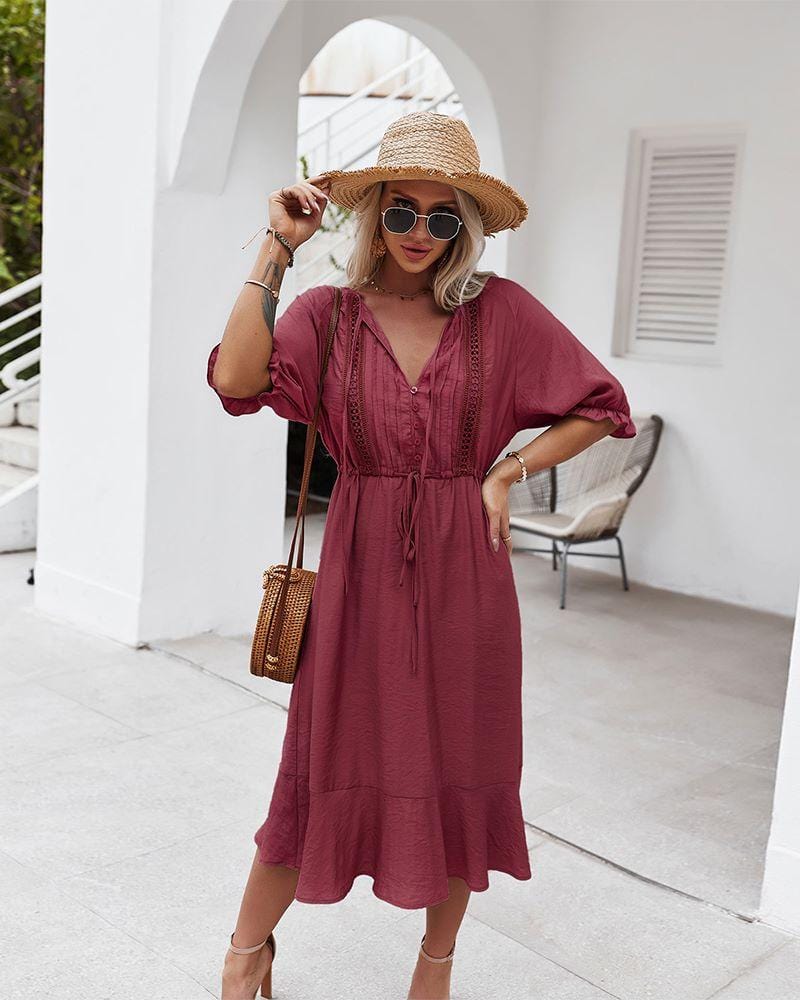 Vibemartini dress is detailed with a feminine crochet detail at the front. Features a tie neck detail. half button front. tie waist. puff sleeves. ruffle hem. flowy skirt. and below knee length. Pair it with a sling bag and sunnies for a beautiful summer look.