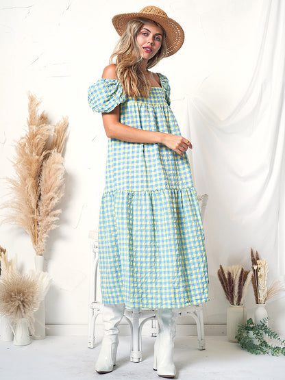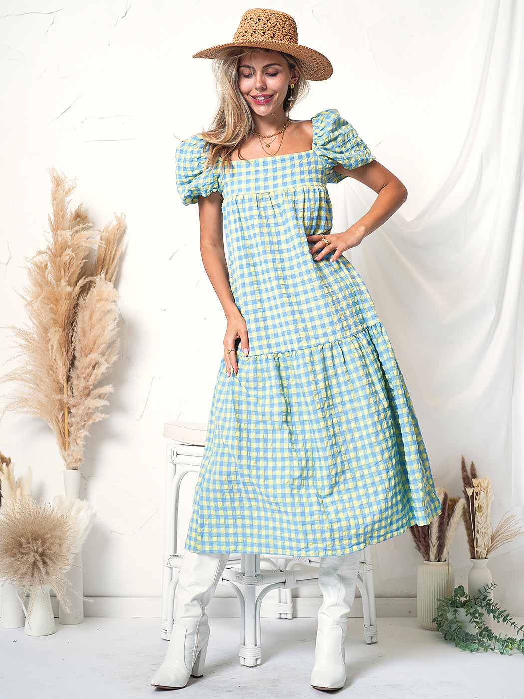 Vibemartini dress details a squared neckline and short puff sleeves. Features a tiered skirt and black elastic detail and opening with tie.