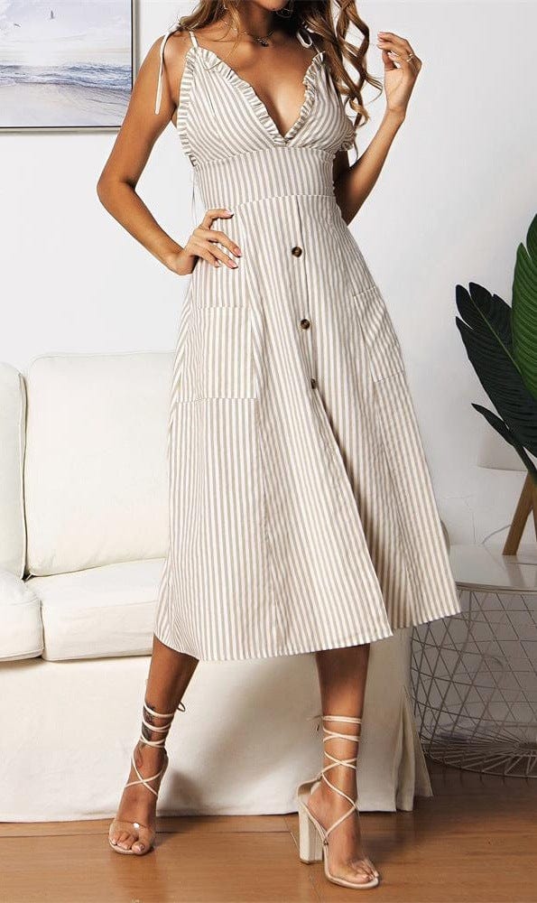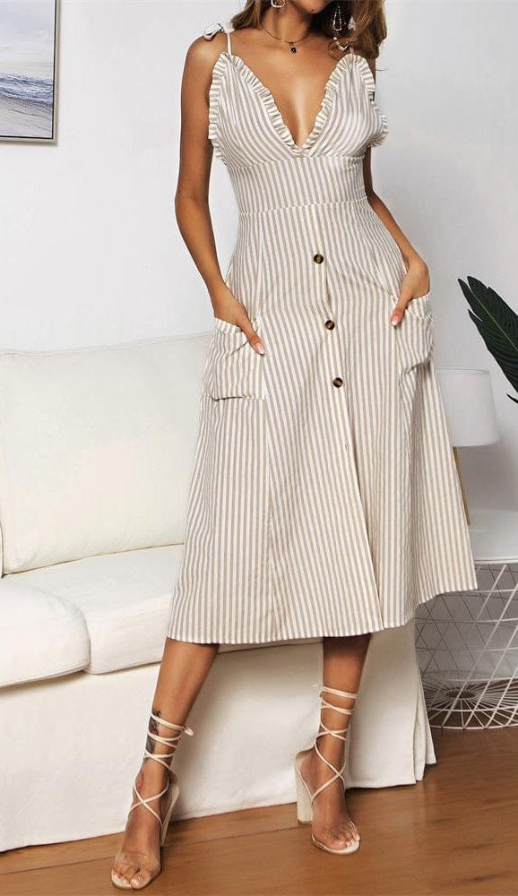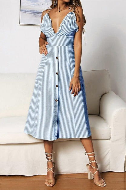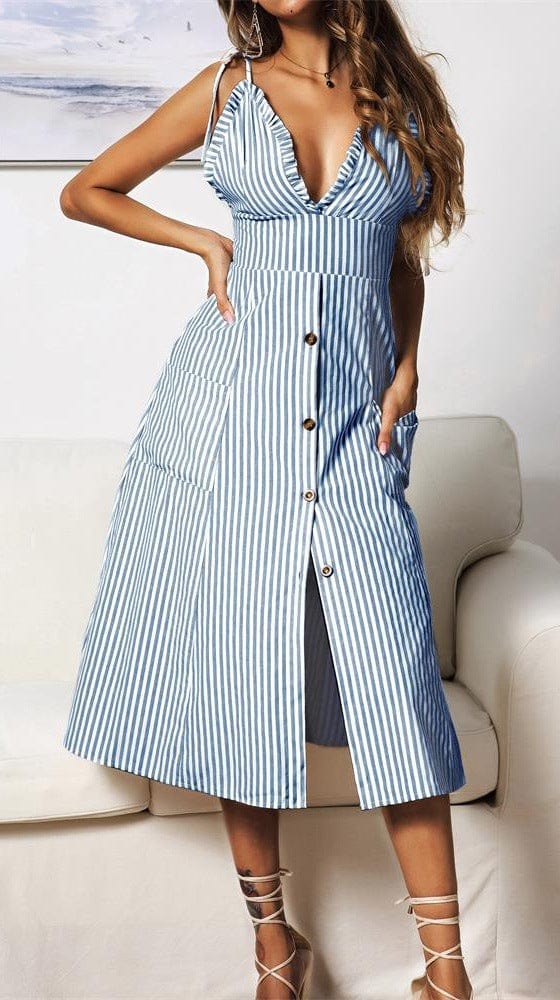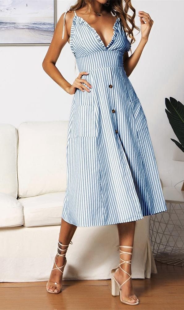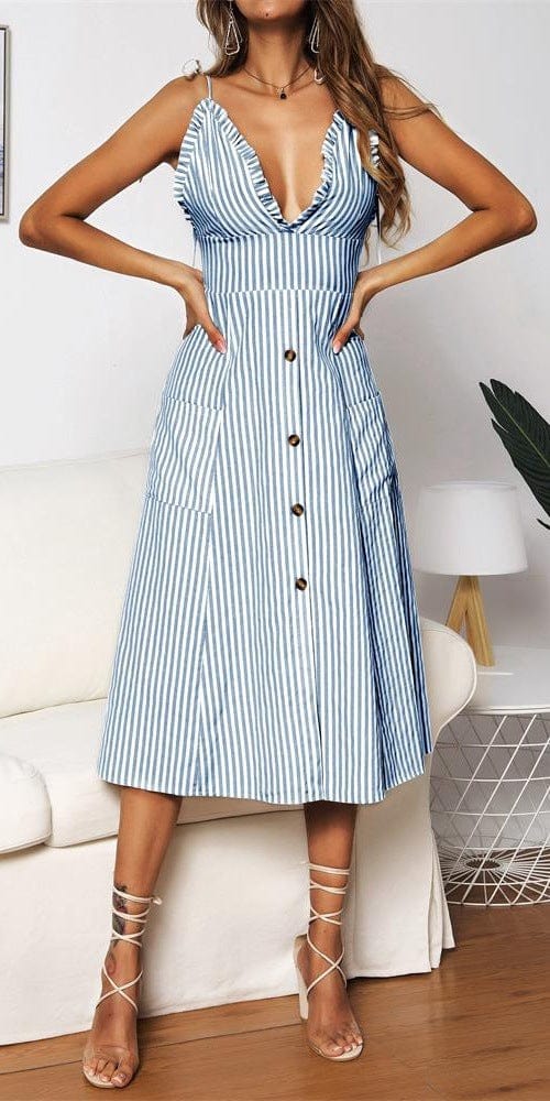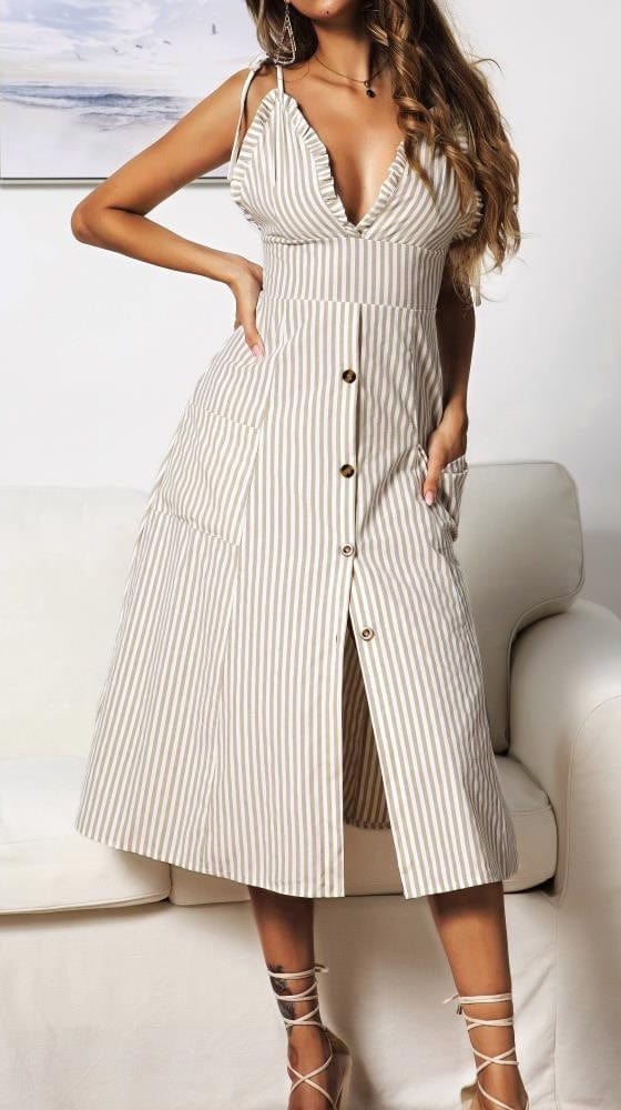 Vibemartini dress is detailed with a sexy plunge neck line. Features nautical stripes. ruffle detail. tie-shoulder straps. button down design. A-line silhouette. and below knee length. Pair it with strappy sandals and a baker boy hat for a chic look.