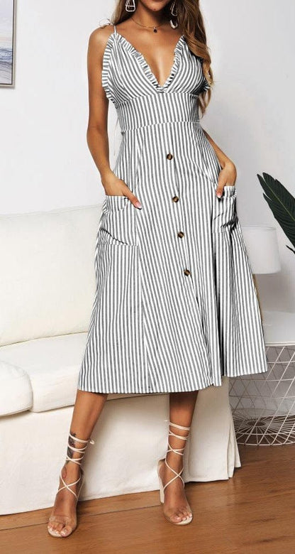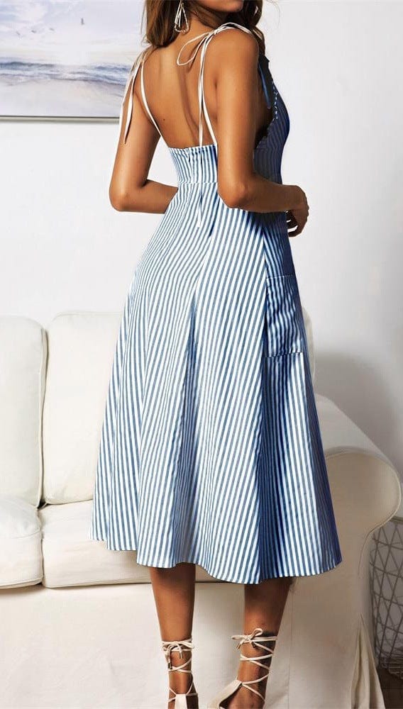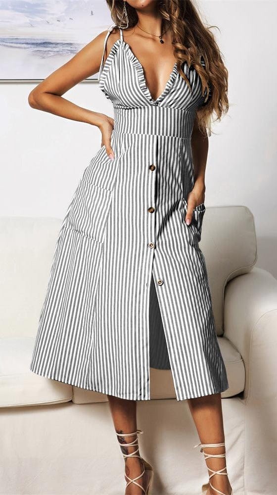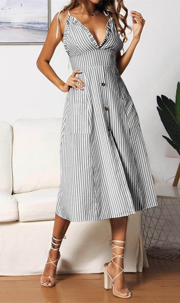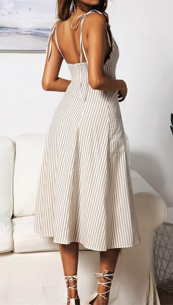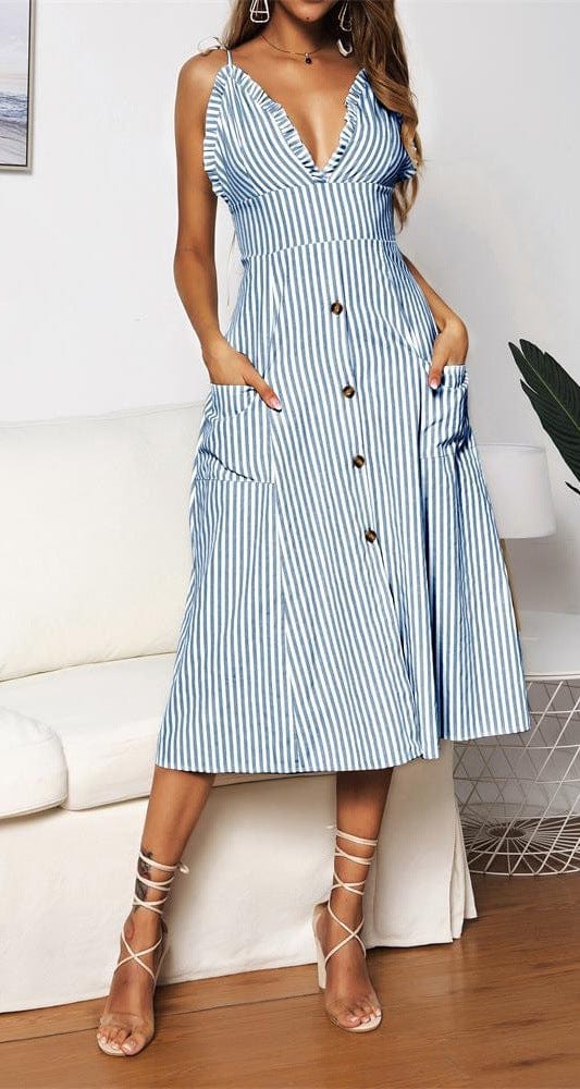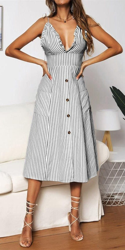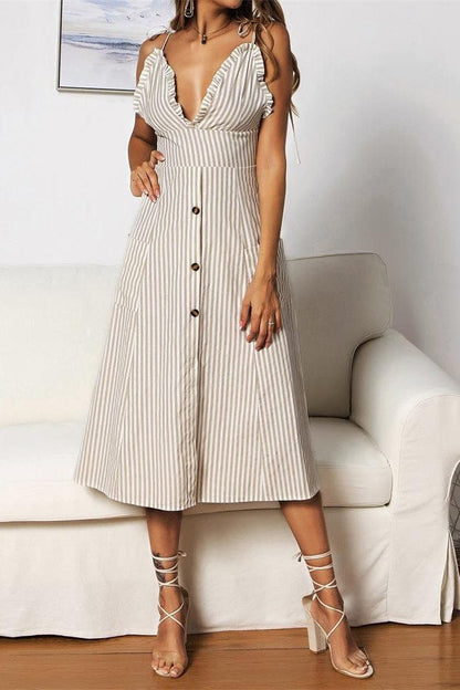 Vibemartini dress is detailed with a sexy plunge neck line. Features nautical stripes. ruffle detail. tie-shoulder straps. button down design. A-line silhouette. and below knee length. Pair it with strappy sandals and a baker boy hat for a chic look.