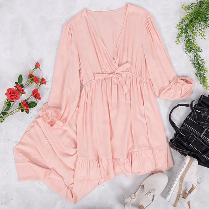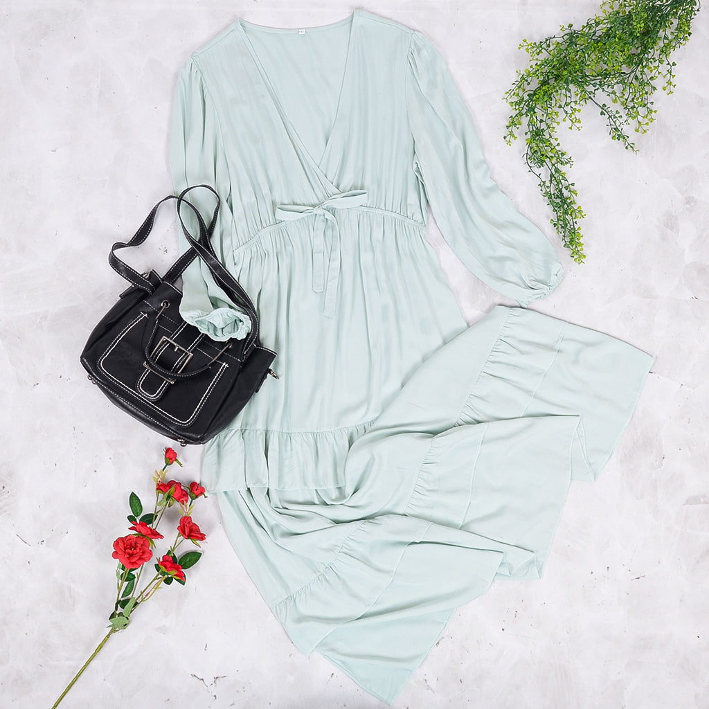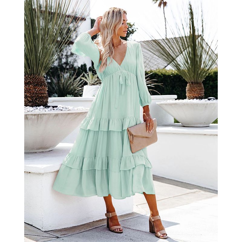 Vibemartini dress is detailed with the cutest ruffle-tiered layers at from top to bottom that help add that flowy romantic flair with every step you take. Features long sleeves. a v neckline. tied belt at the chest. and midi dress length. Easily pair with your favorite heels for a cute brunch weekend date.