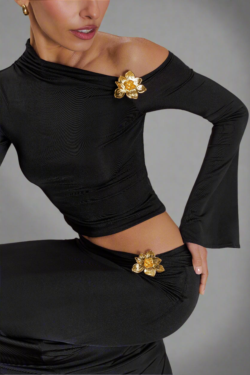 • Floral hardware detail and flattering lined bodice