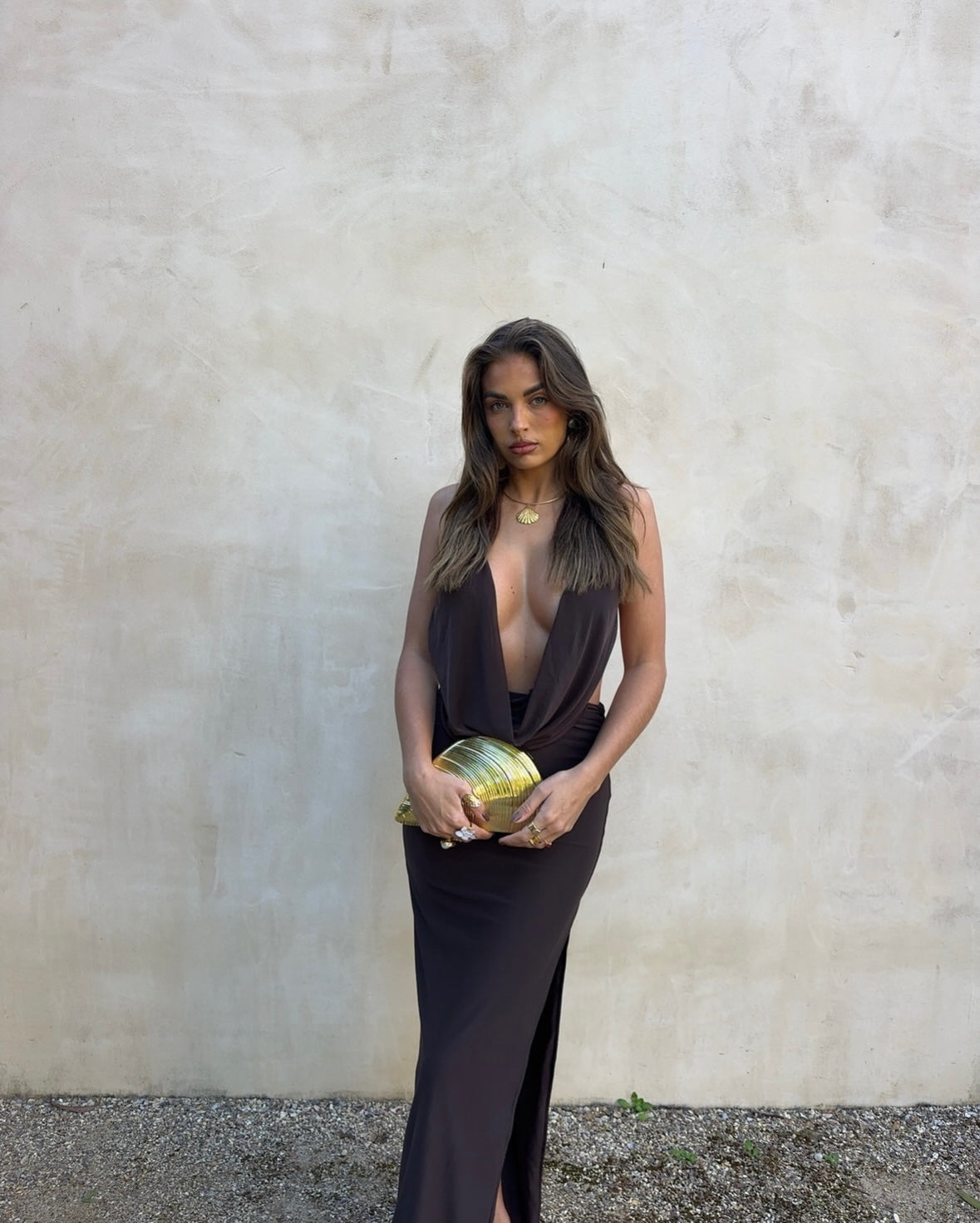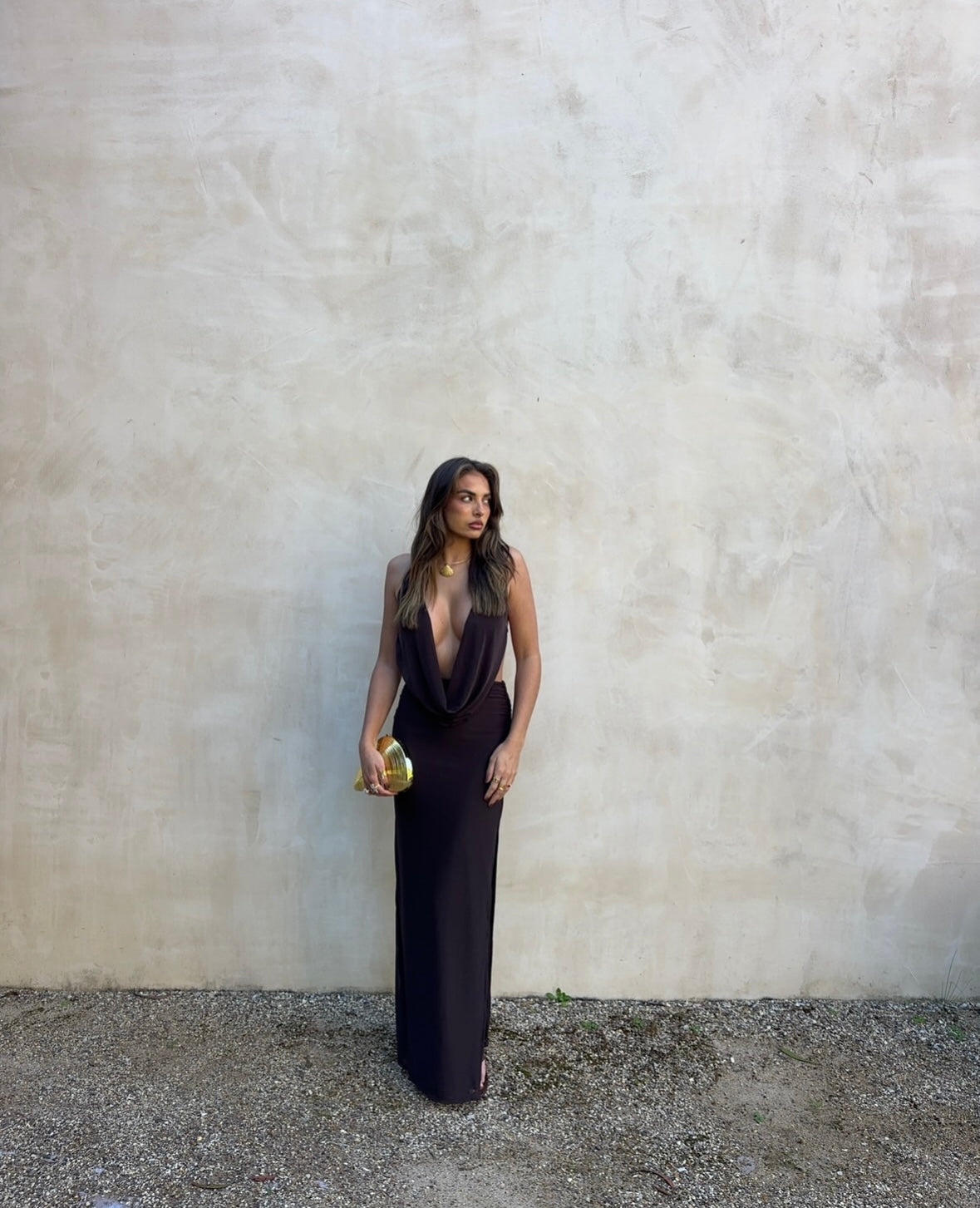 Steal the show in the Neither One Of Us Maxi Dress in Chocolate. Featuring a halter neck design with self tie, ultra plunge cowl neckline, maxi length, side split design, backless with self tie strap, mesh lined, figure hugging fit and stretch material for an easy slip on design. Style with perspex heels and a black shoulder bag to let the dress do all the talking