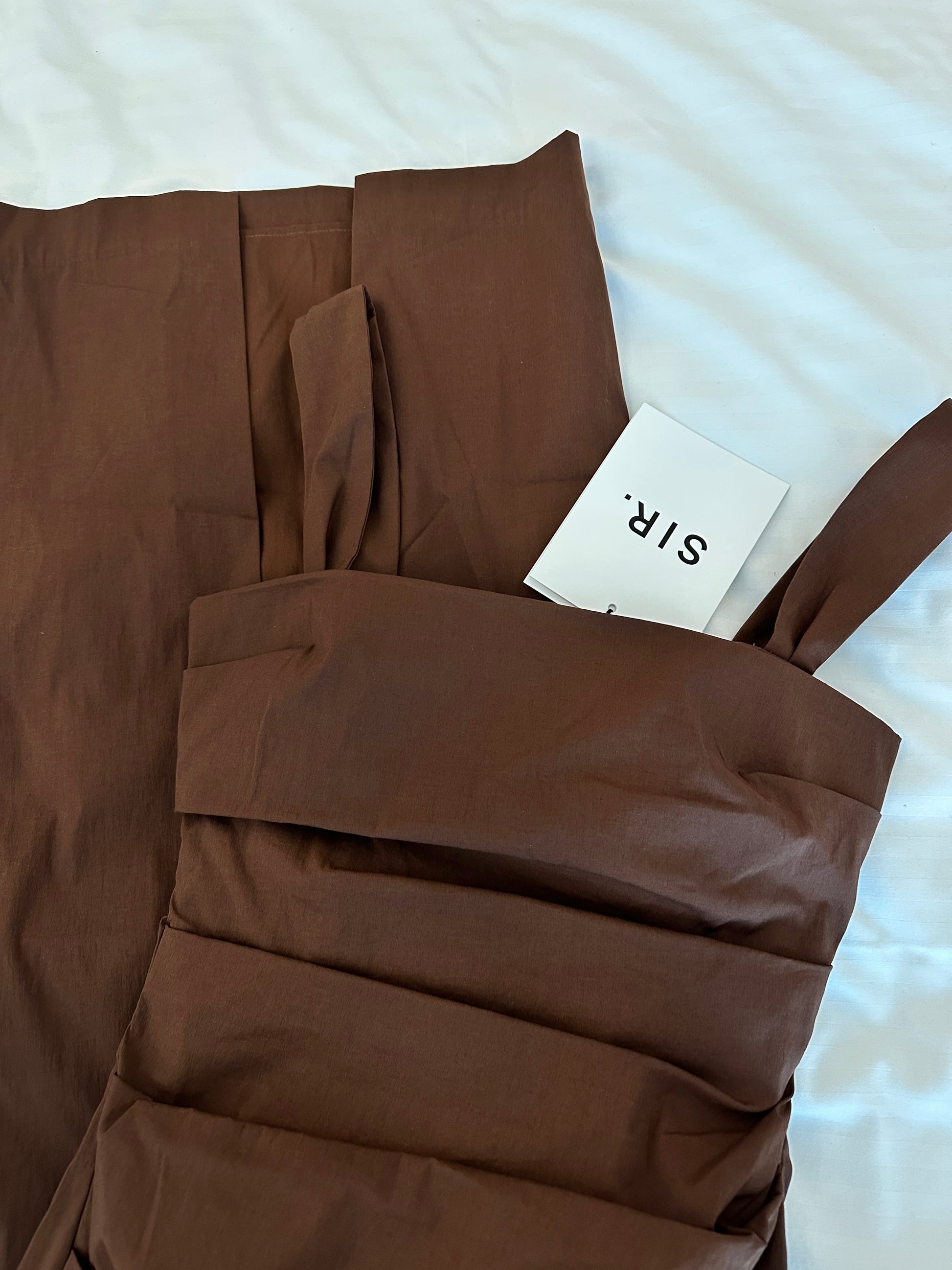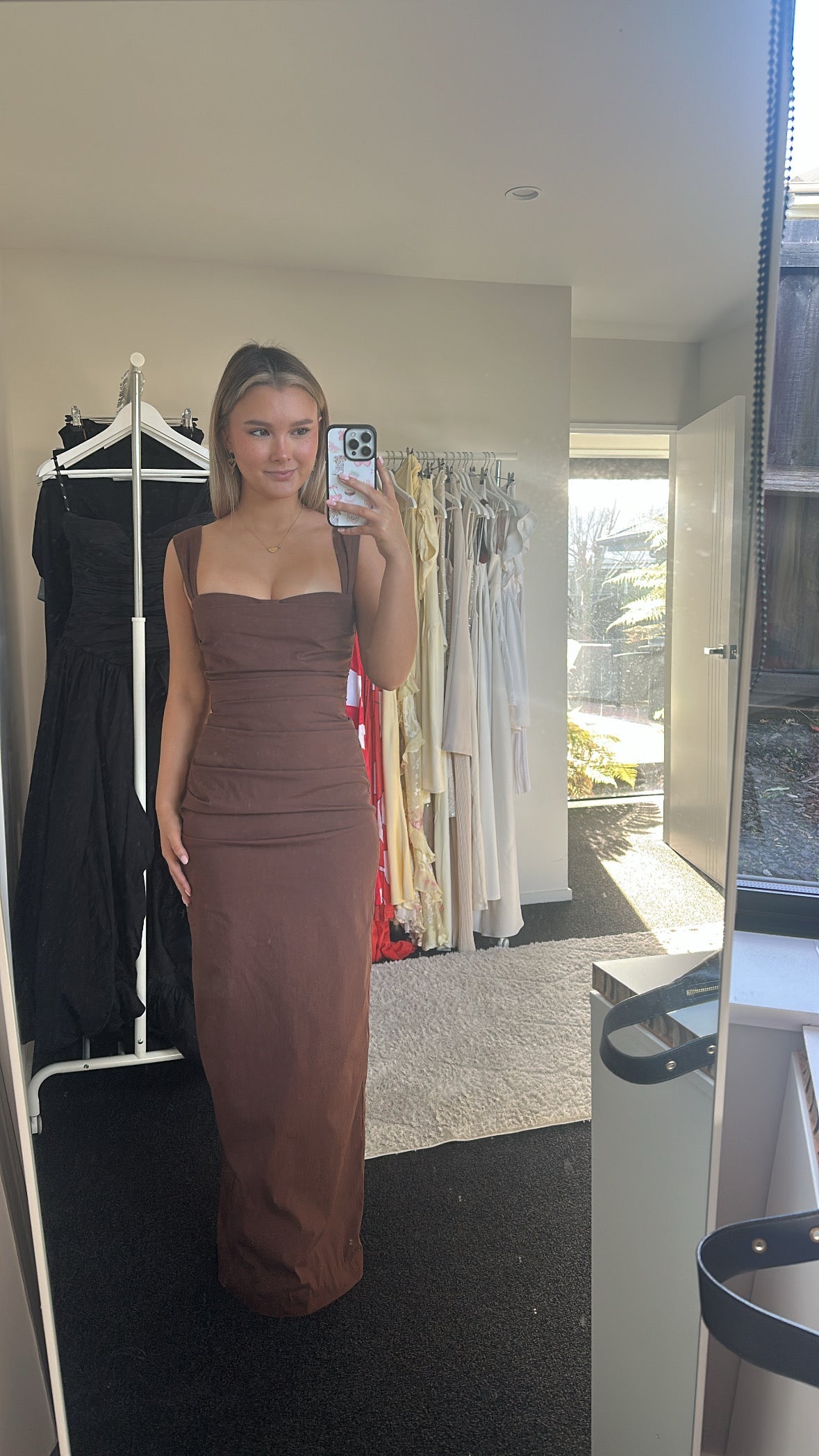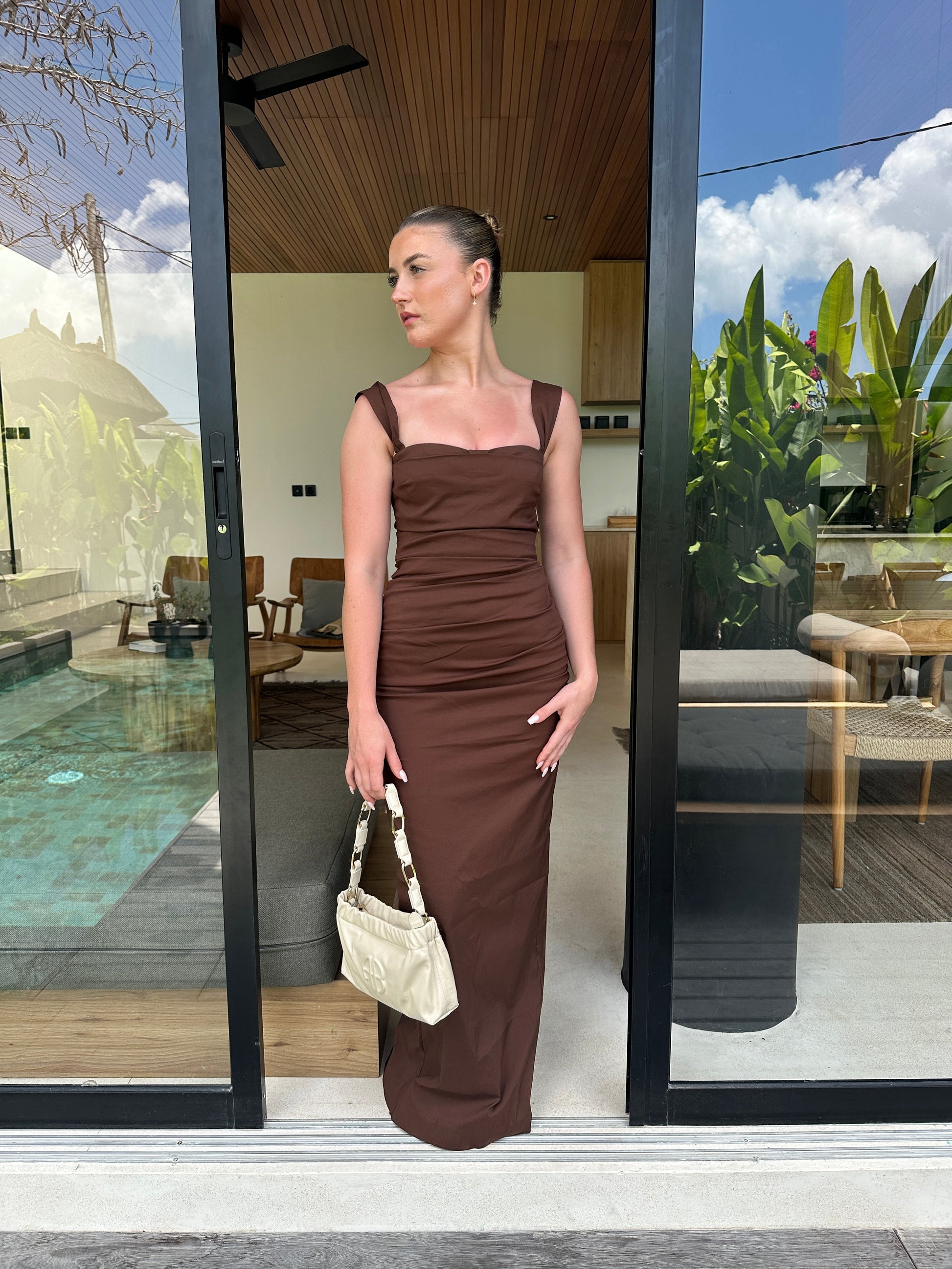 The Dahlia Balconette Gown in Chocolate is a feminine and modern dress, ideal for any special occasion. It features wide straps, an underwire bustier detail, back split and tucks for a gathered finish through the body. Crafted from an Italian cotton fabrication offering ruching through the waist to ensure a flattering fit.