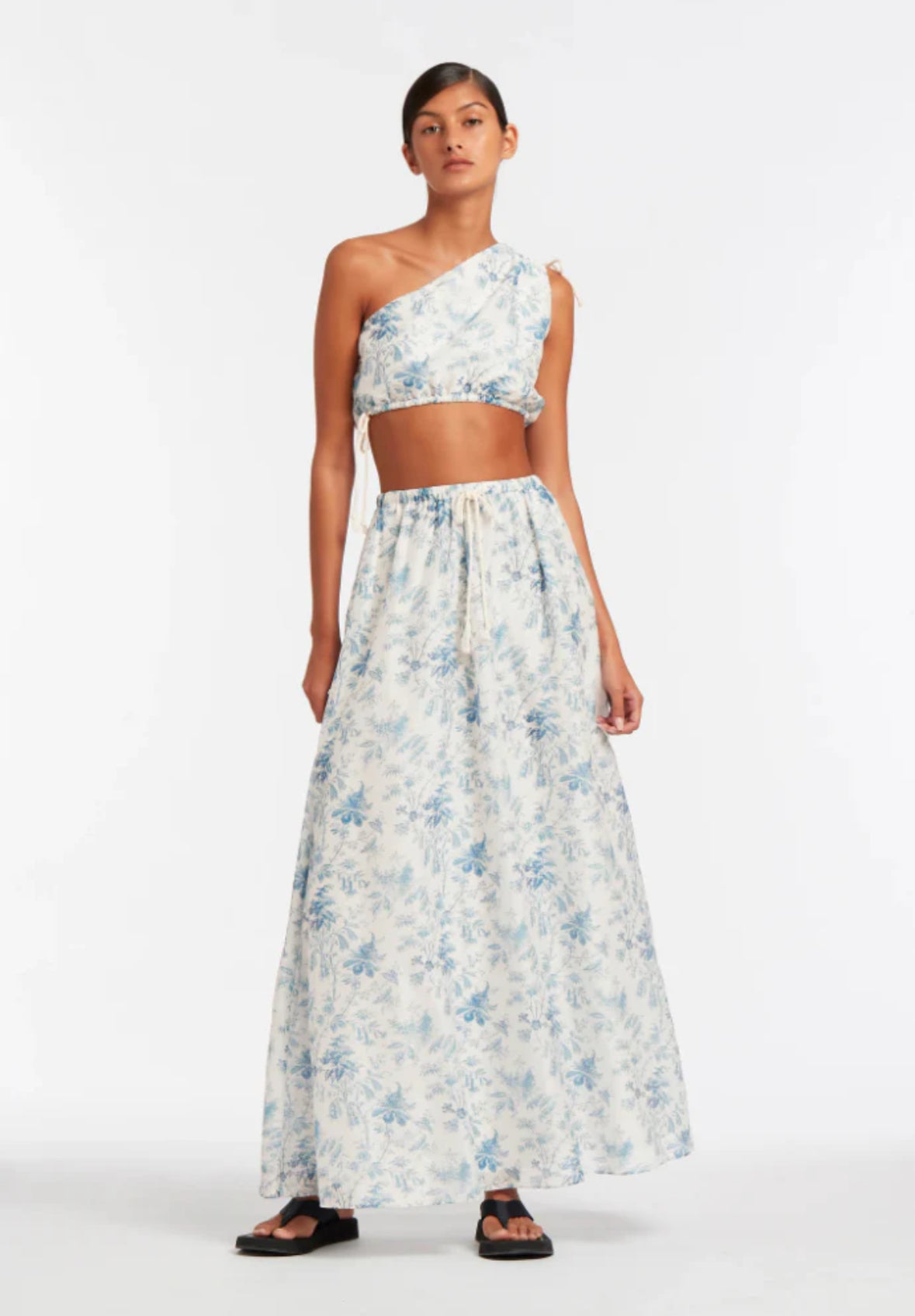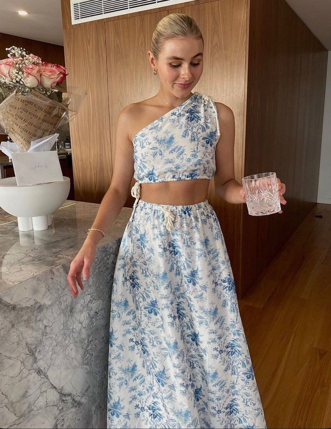 The Clementine Set features adjustable corded rope detailing at the shoulder and waist. This one shoulder top slips on and is fully lined, perfect for ladies lunches and cocktail hour. A high waisted, full maxi skirt with a corded rope drawstring at the waist.