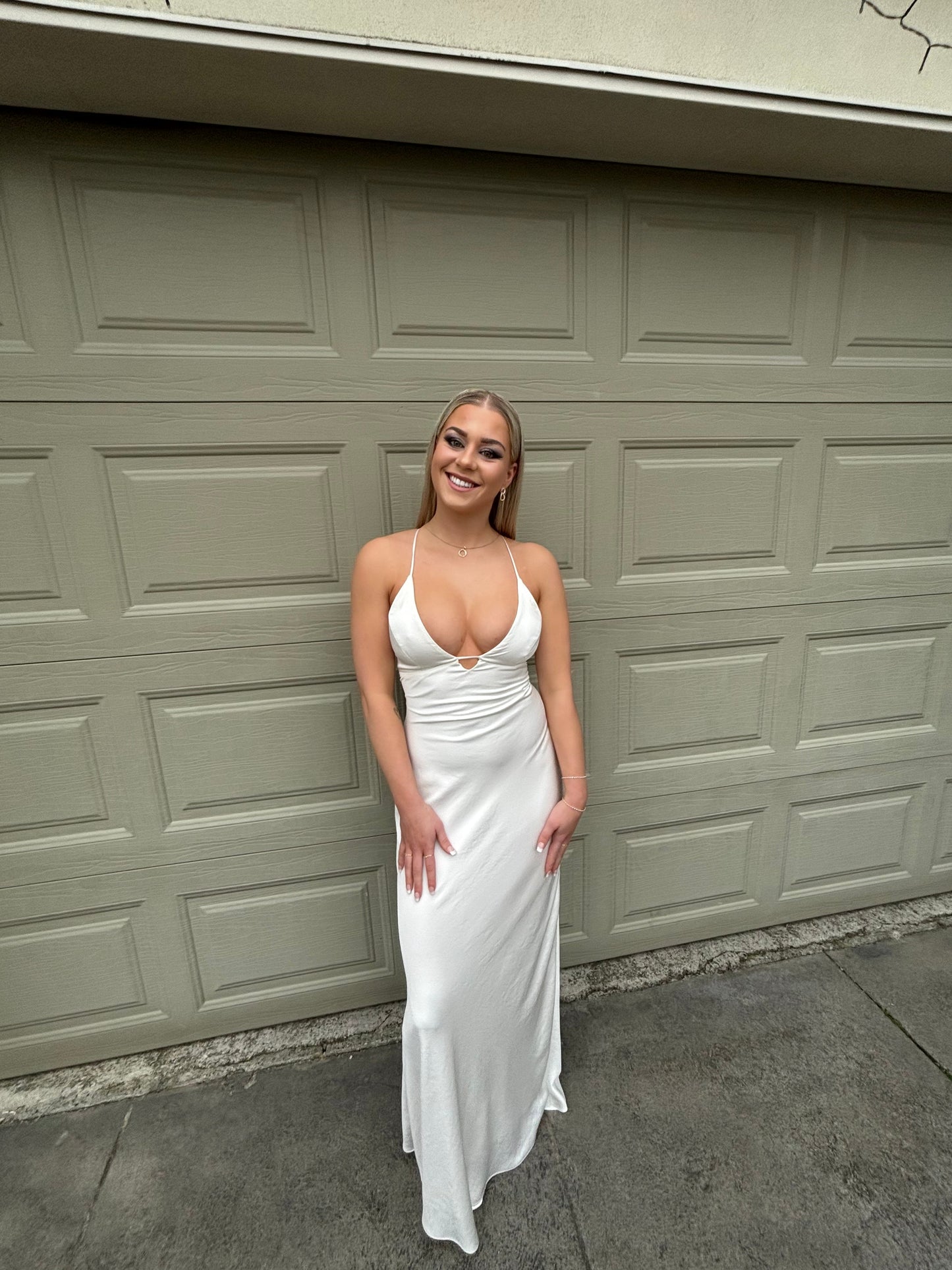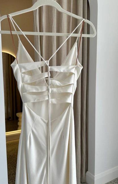 The contemporary update on a timeless silhouette is perfect for your next formal, wedding or special moment in your life. The floor length gown features a deep V-neckline with bust detailing and is beautifully defined by its adjustable open back detailing. Adjustable fit and invisible centre back zip.