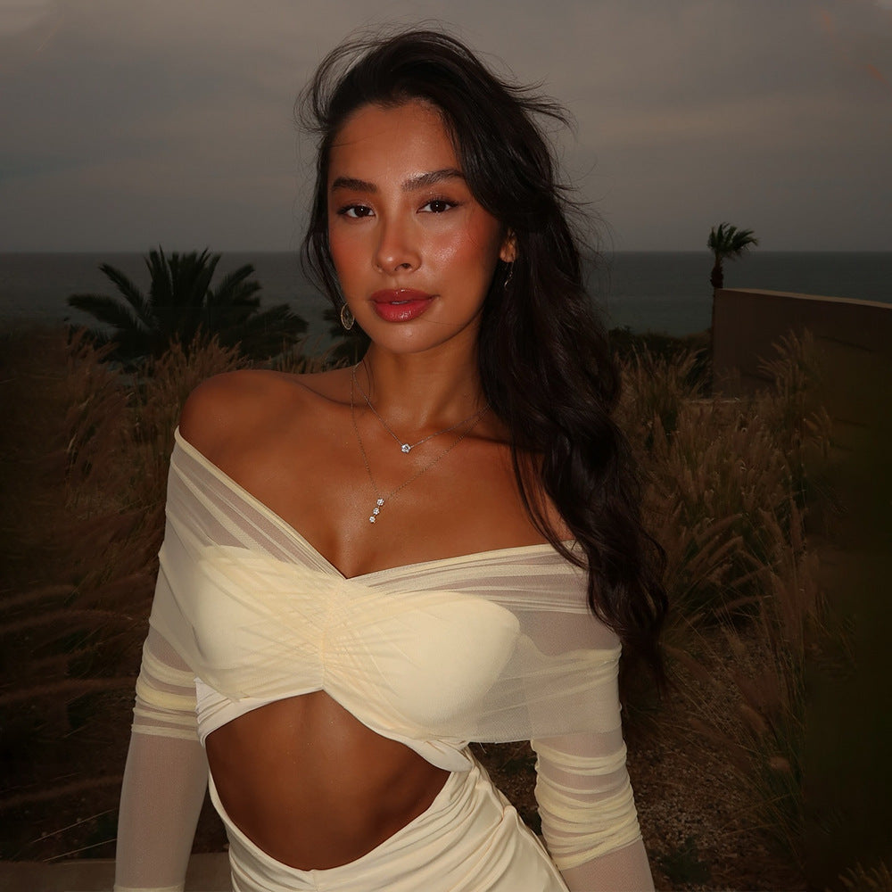 A little drama and a little glamour. Our Siela Maxi Dress is here to serve. with Off shoulder neckline.