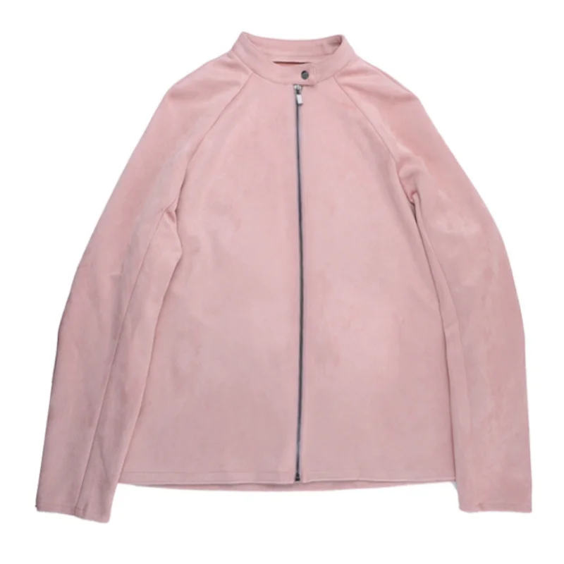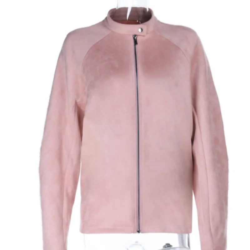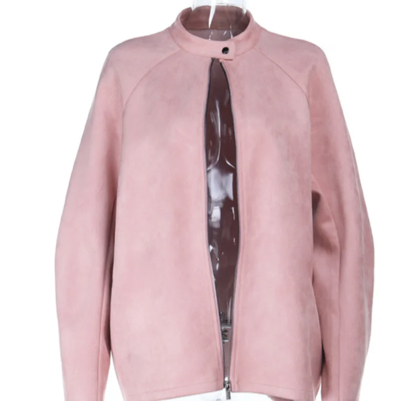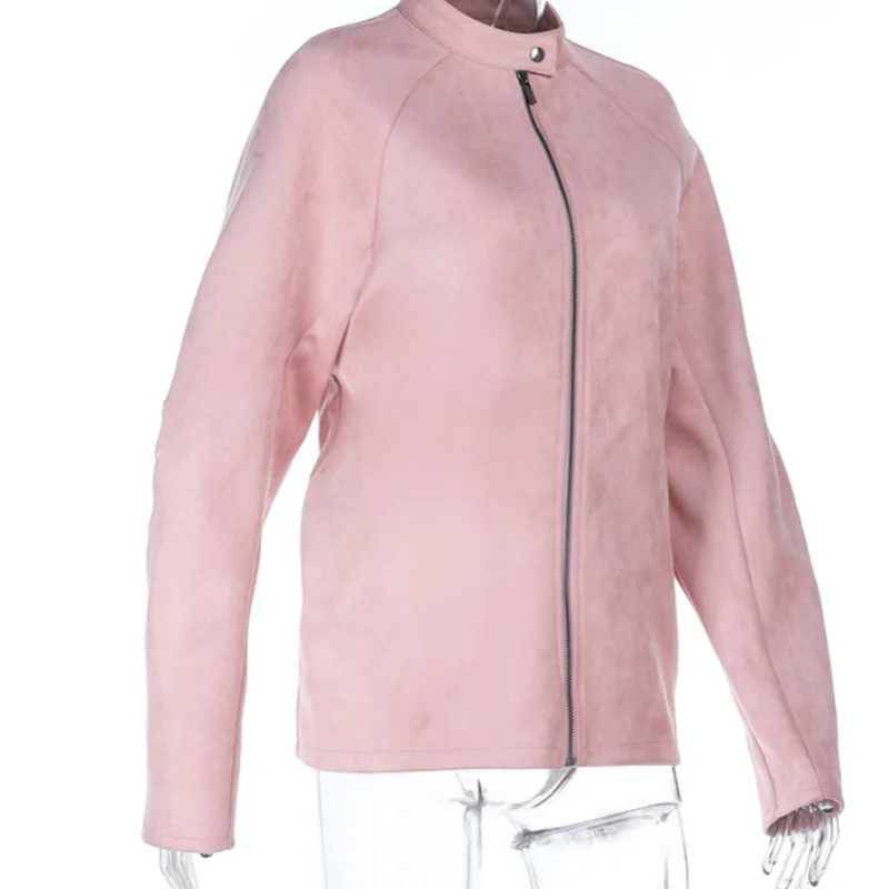 Elegant Suede Pink Jacket Women Loose Long Sleeve Zipper Stand Collar Button Female Jackets 2025 Autumn Street Outwear Lady New