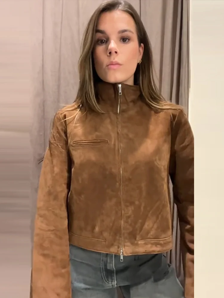 Stand Collar Suede Leather Jacket Coat Zipper Retro Long Sleeved Casual Biker Jackets Loose Fashion Front Shoulder Short Outwear