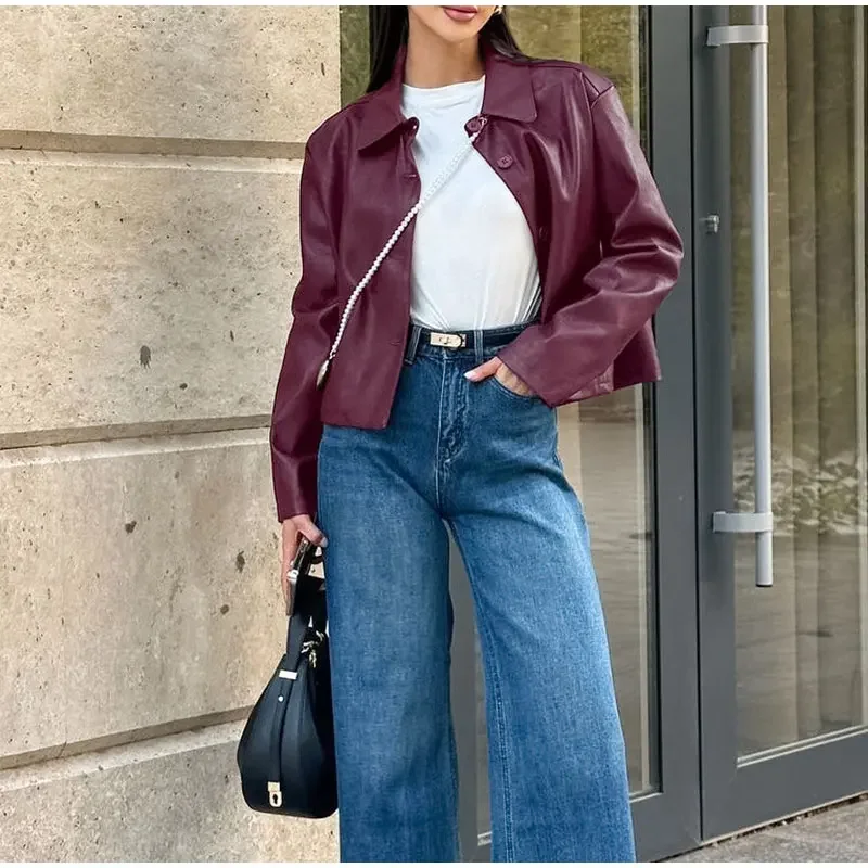 Burgundy Faux Leather Jackets Women Moto Biker Lapel Zipper Long Sleeve Female Coats 2025 Spring Casual Lady Street Outwear