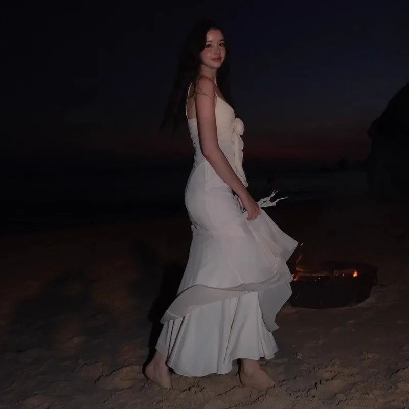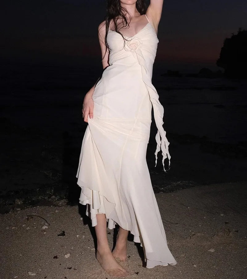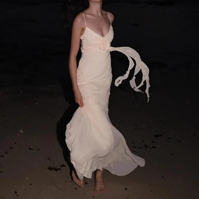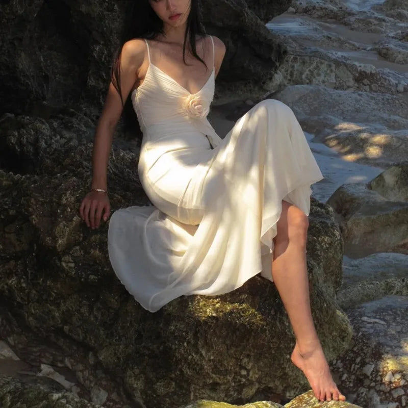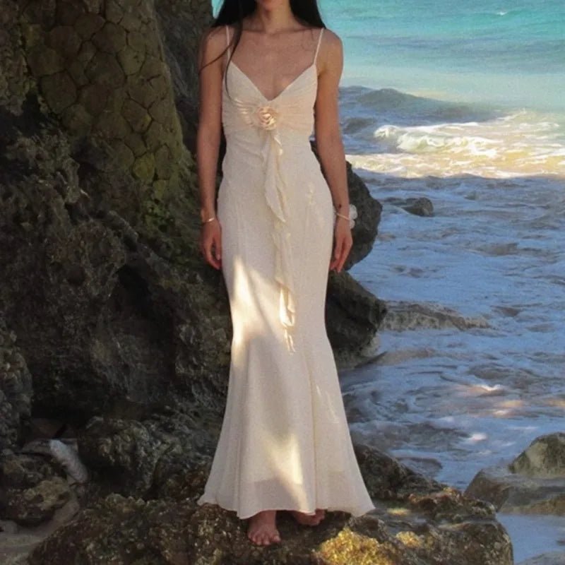 Apricot V-neck with Floral Dress Women Strapped Sleeveless Elegant Vintage Clothing Lady Streetwear Vestidos Bodycon