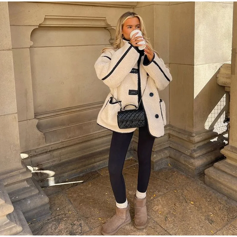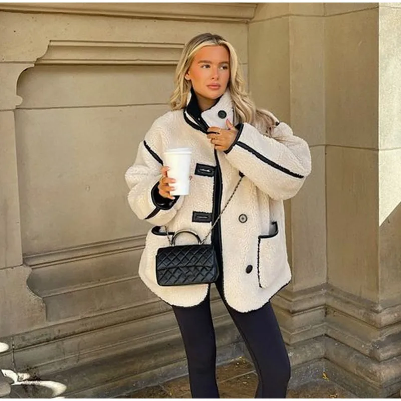 Plush Stand Collar Jackets Coat Women Vintage Lambwool White Single-Breasted Pockets Jacket Female Autumn High Street Outwear