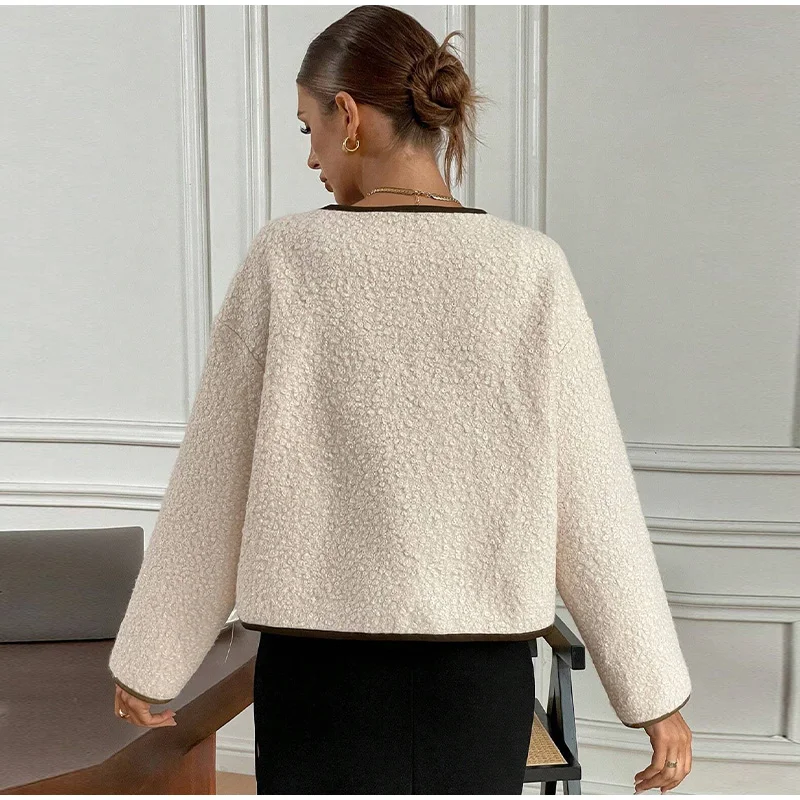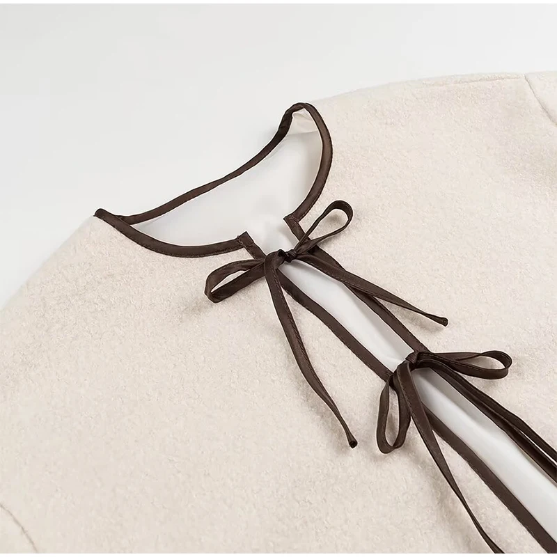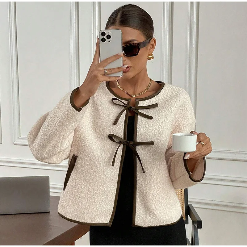 Elegant Women's Lamb Wool Cropped Cardigans Round Neck Lace-Up Long Sleeve Pocket Short Jackets 2024 Autumn New In Outerwears