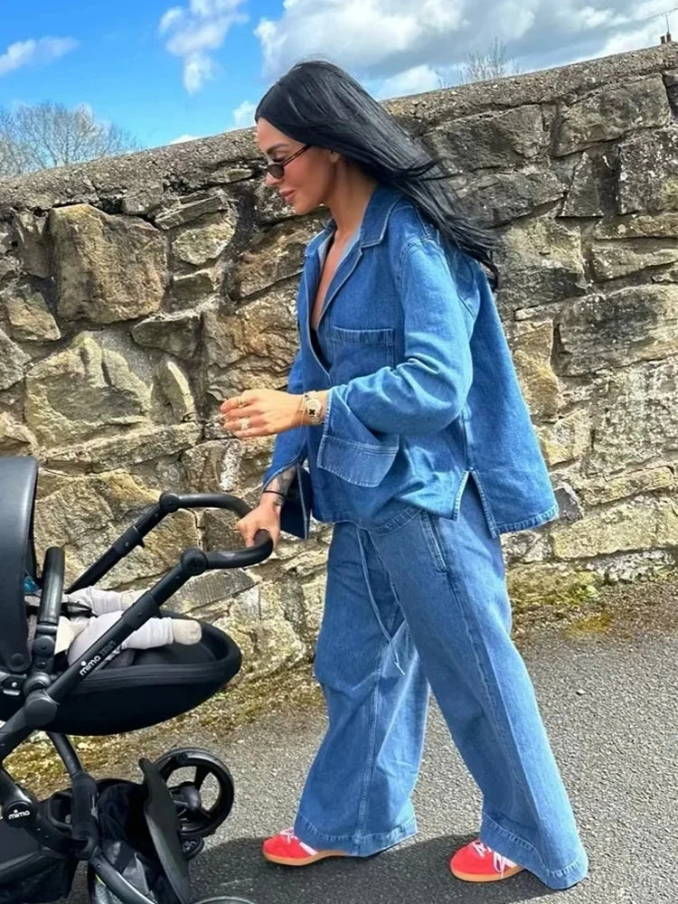 Denim Jacket Pants Set Outfits Women Autumn Winter Blue Pockets Loose 2 Pcs Set Casual Female Matching Set Retro