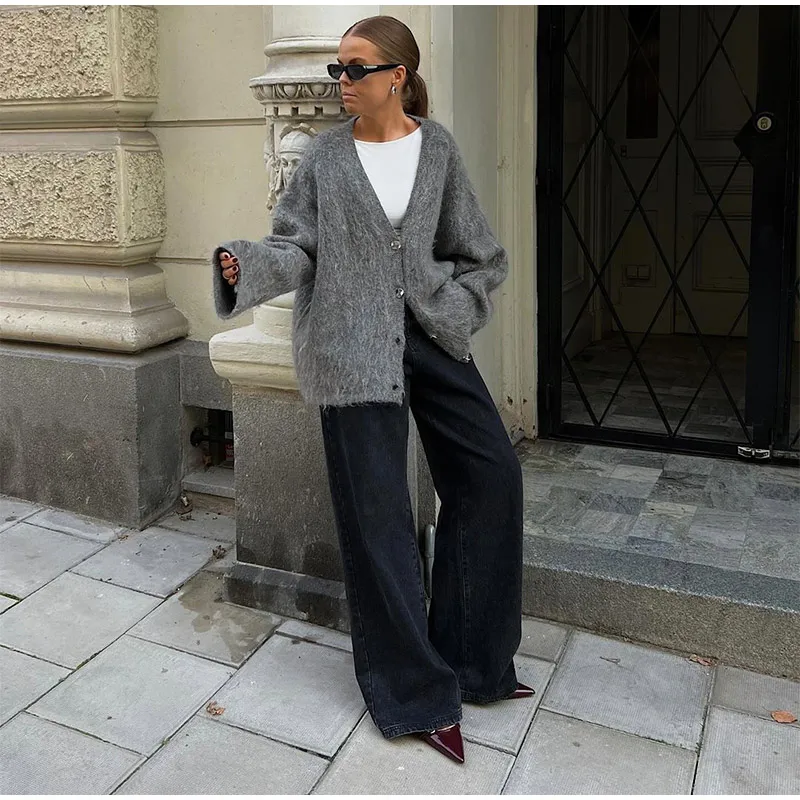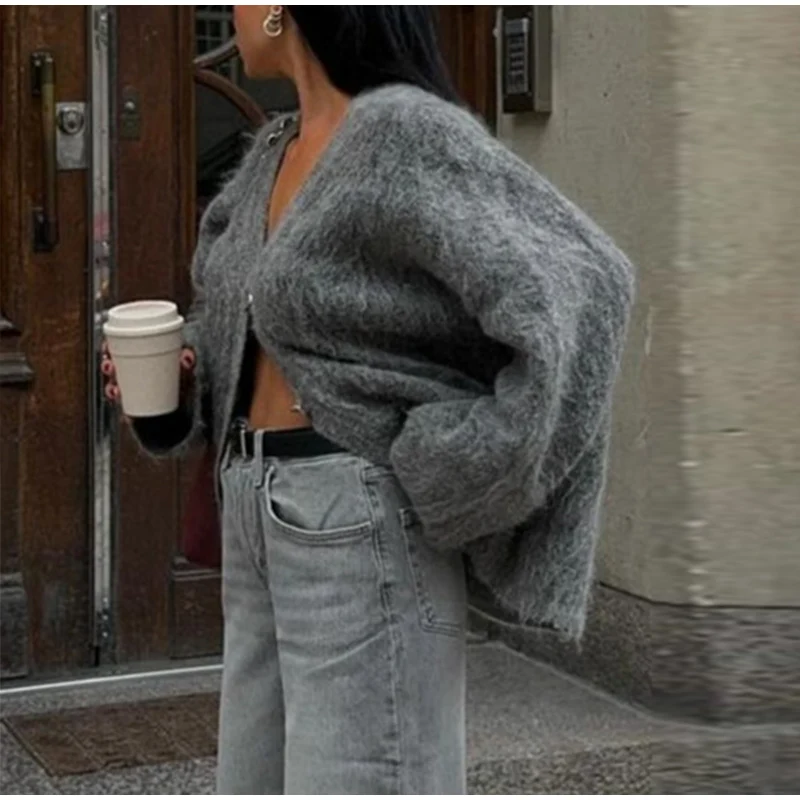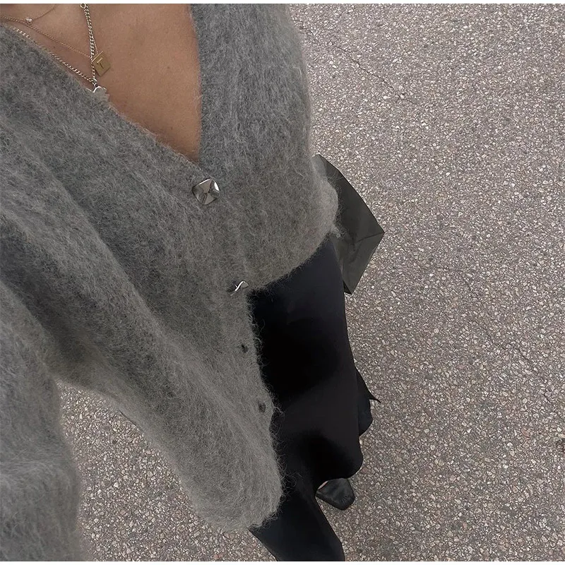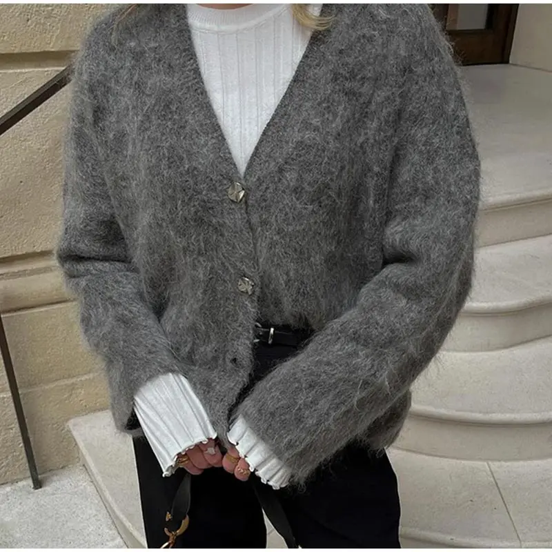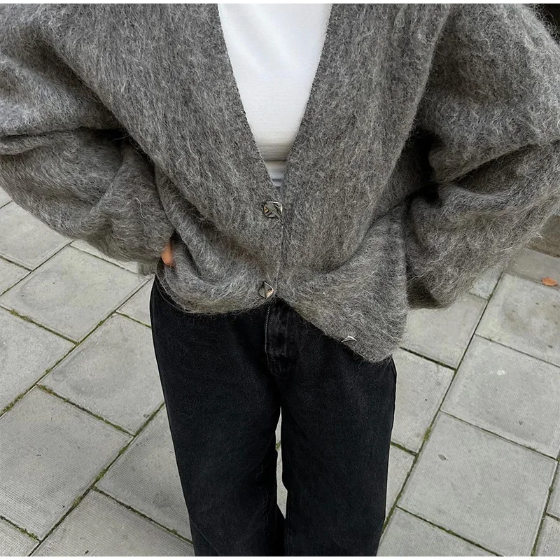 Knitted Cardigans Women Single Breasted Chic V-neck Loose Long Sleeve Sweater Winter Gray All-match Coat Tops