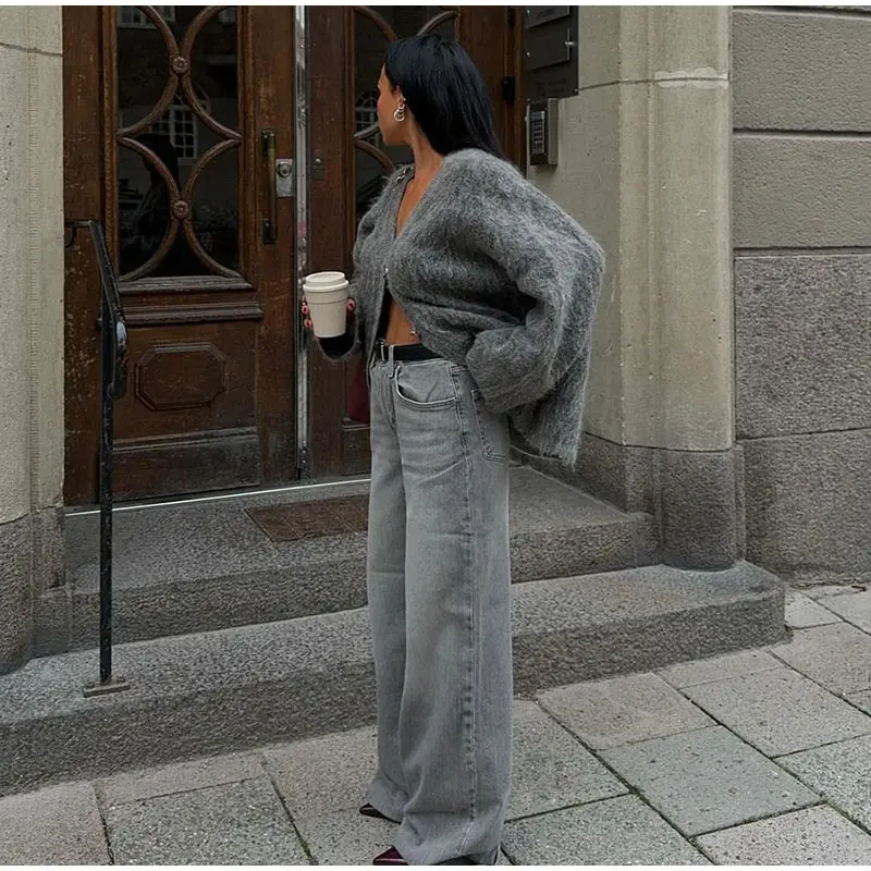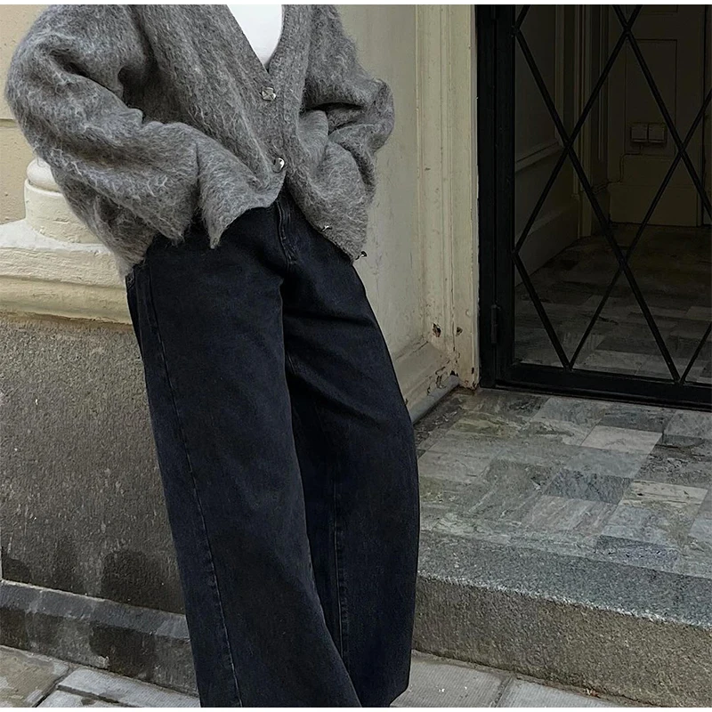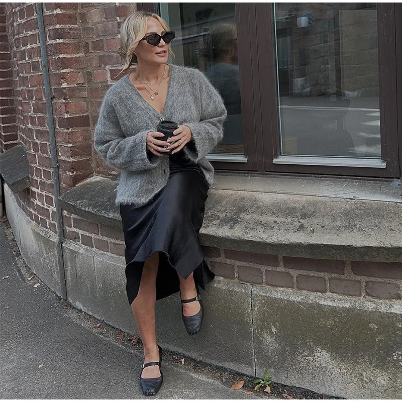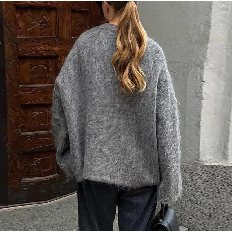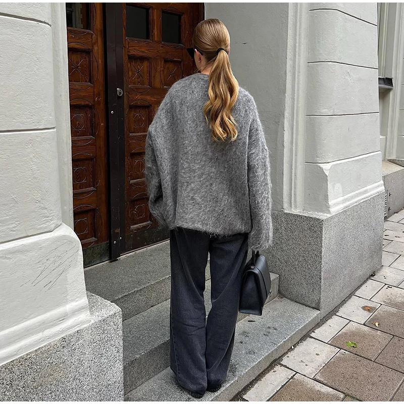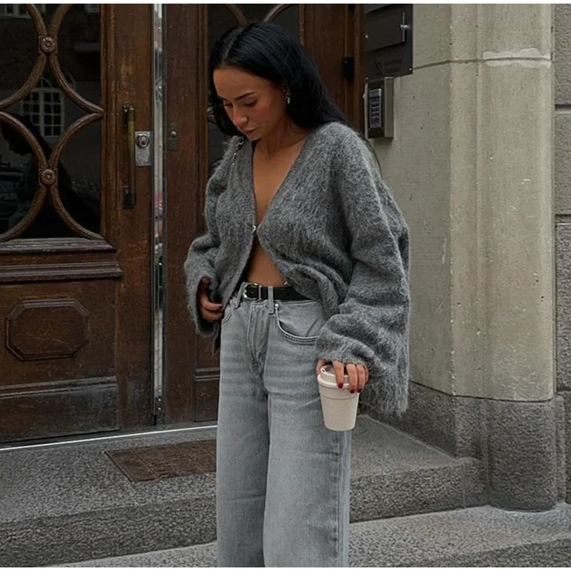 Knitted Cardigans Women Single Breasted Chic V-neck Loose Long Sleeve Sweater Winter Gray All-match Coat Tops
