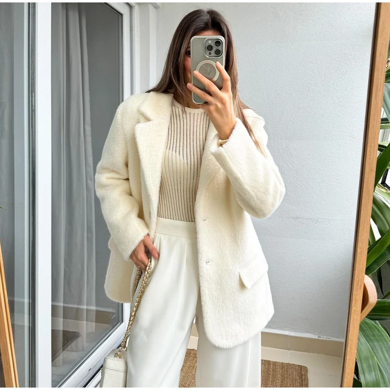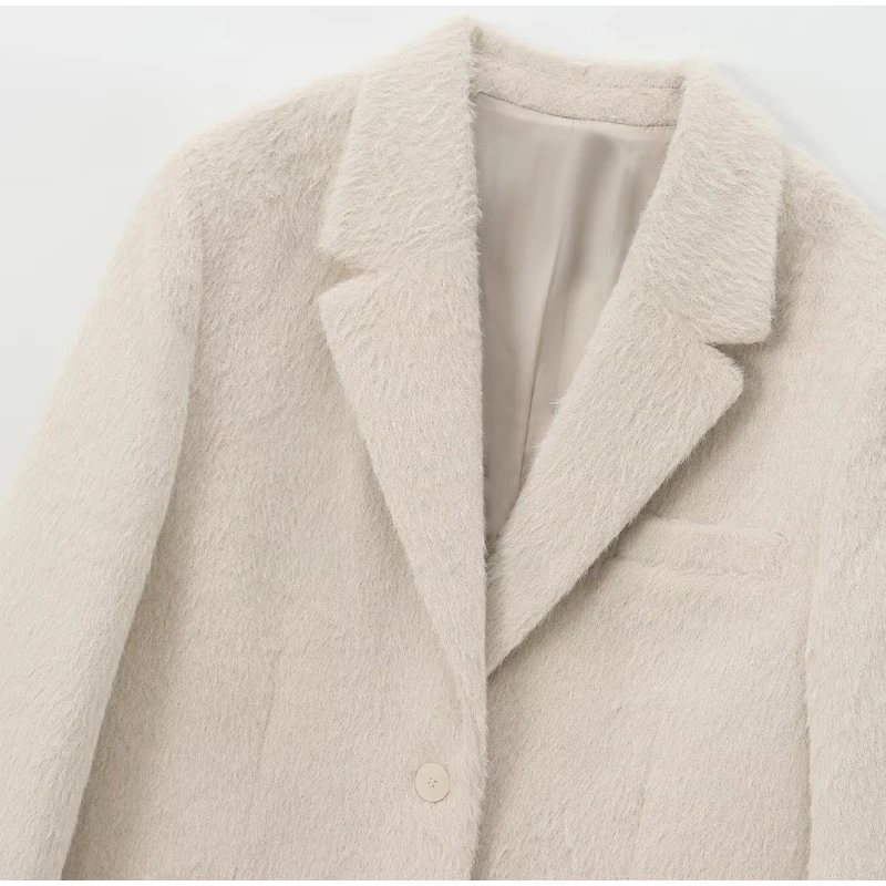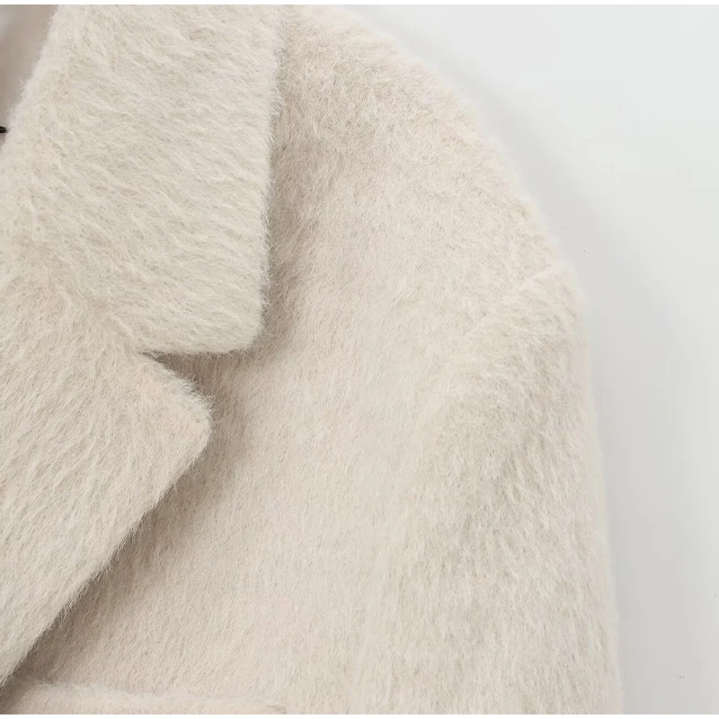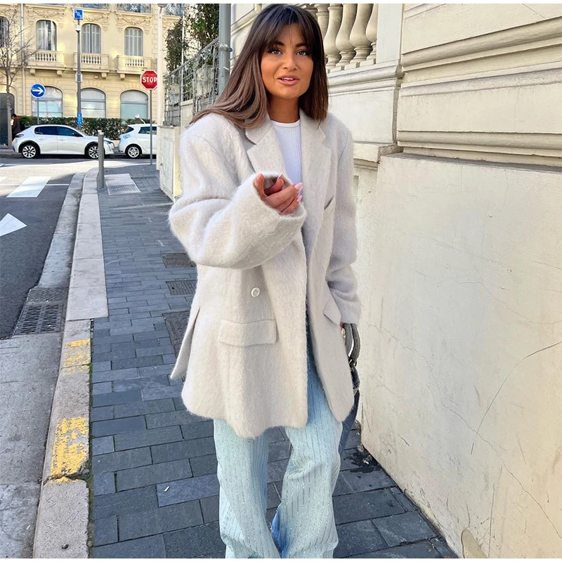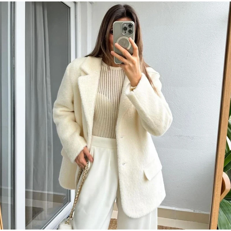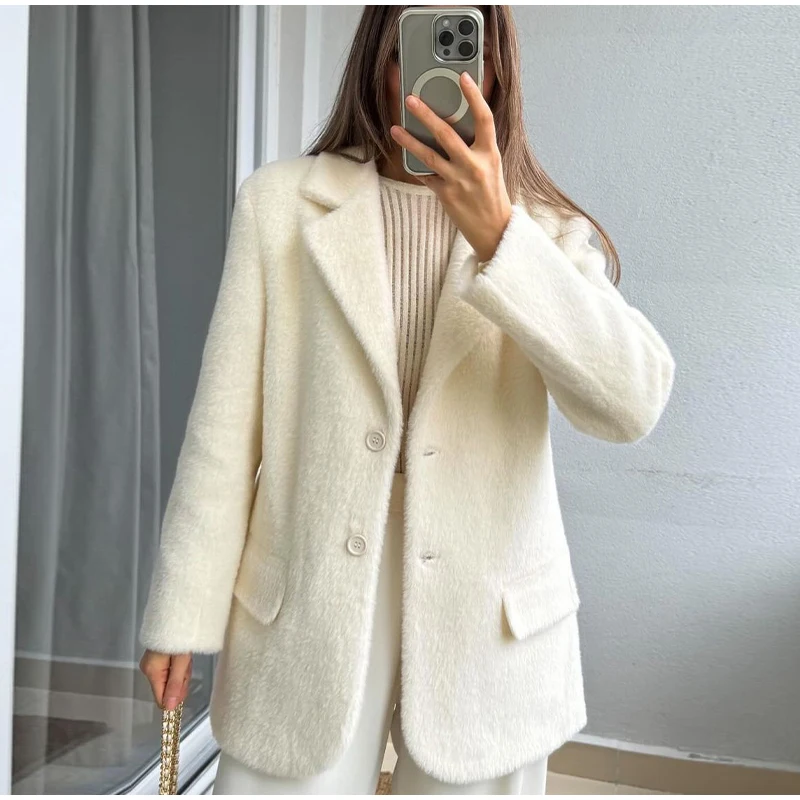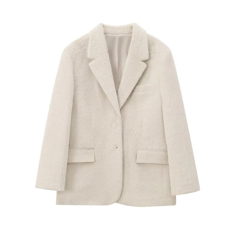 Furry Woolen Oversize Blazer Coat Women Turn-down Collar Button Up Thicken Warm Outwear Winter Long Sleeve Jacket Tops