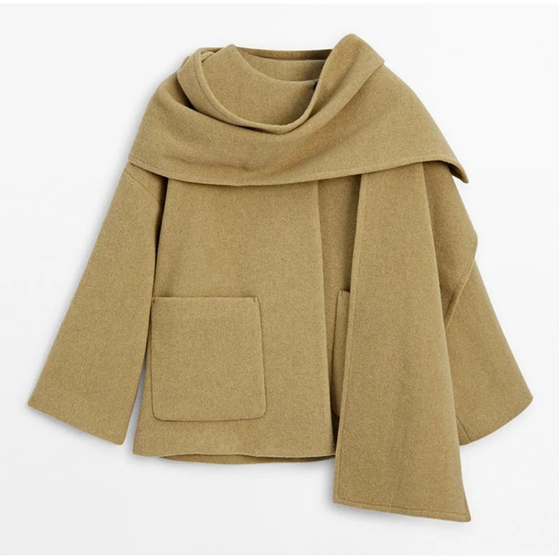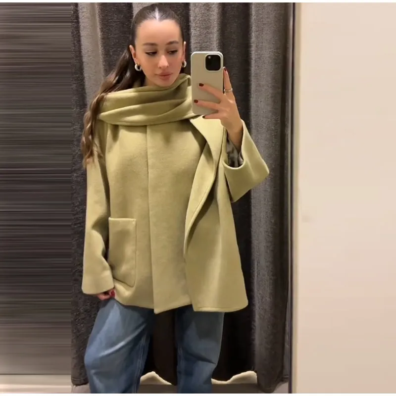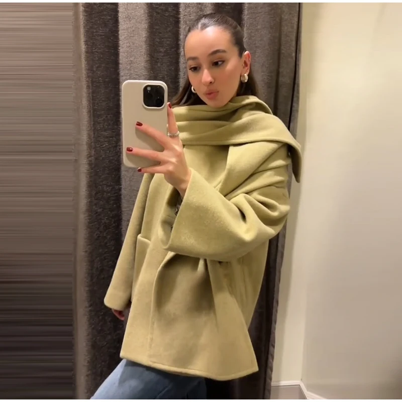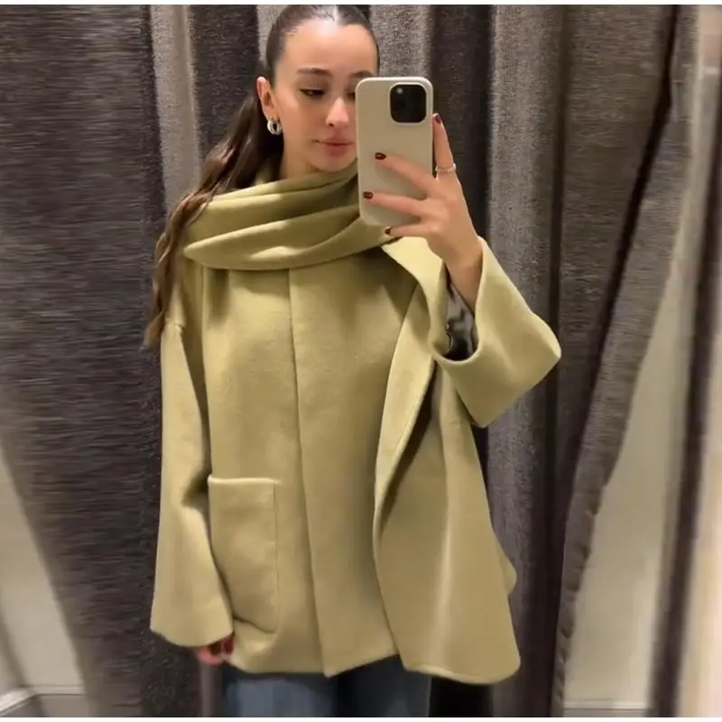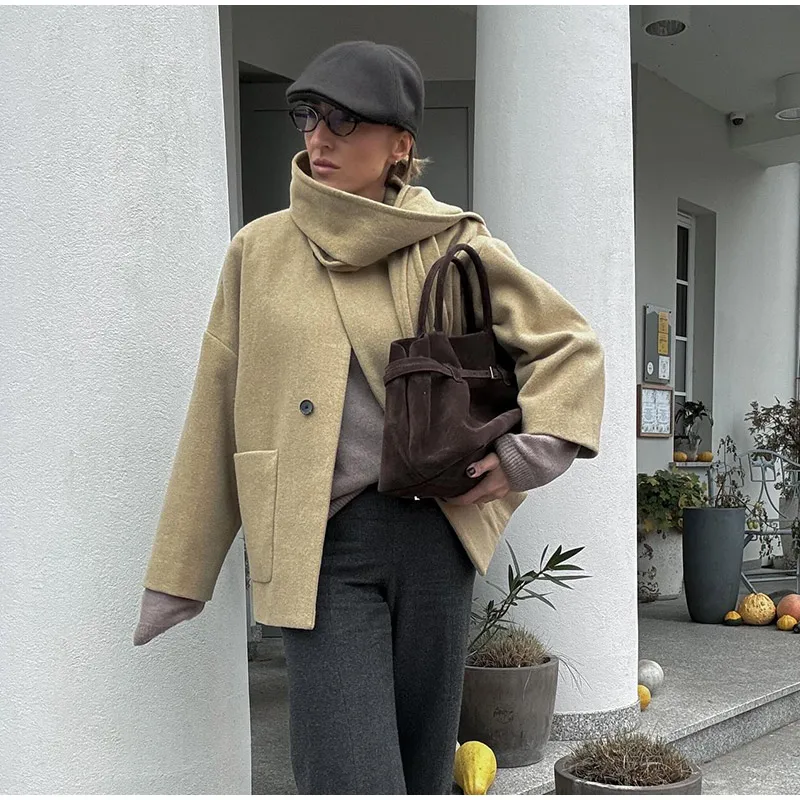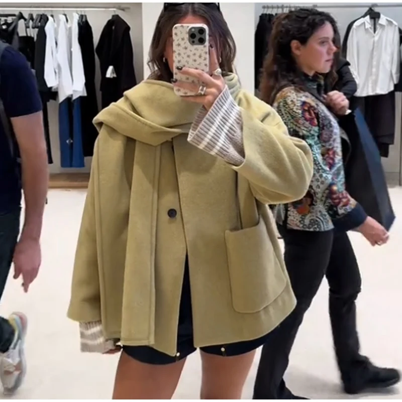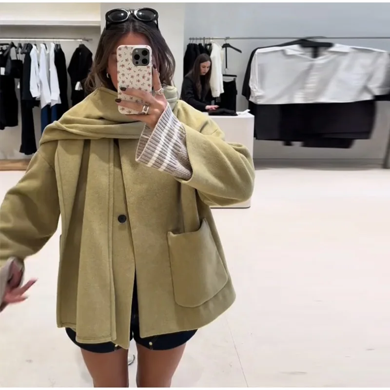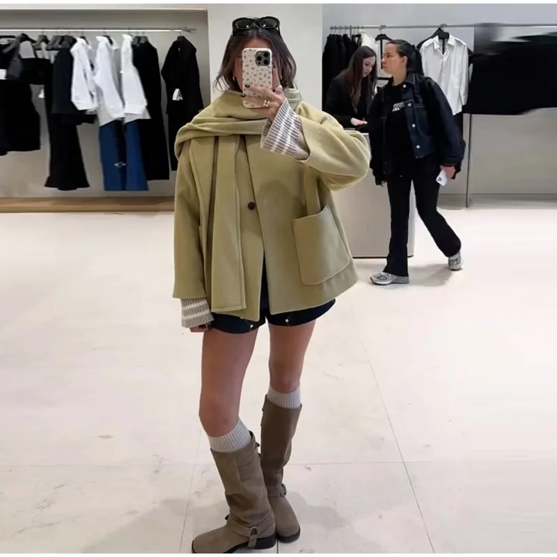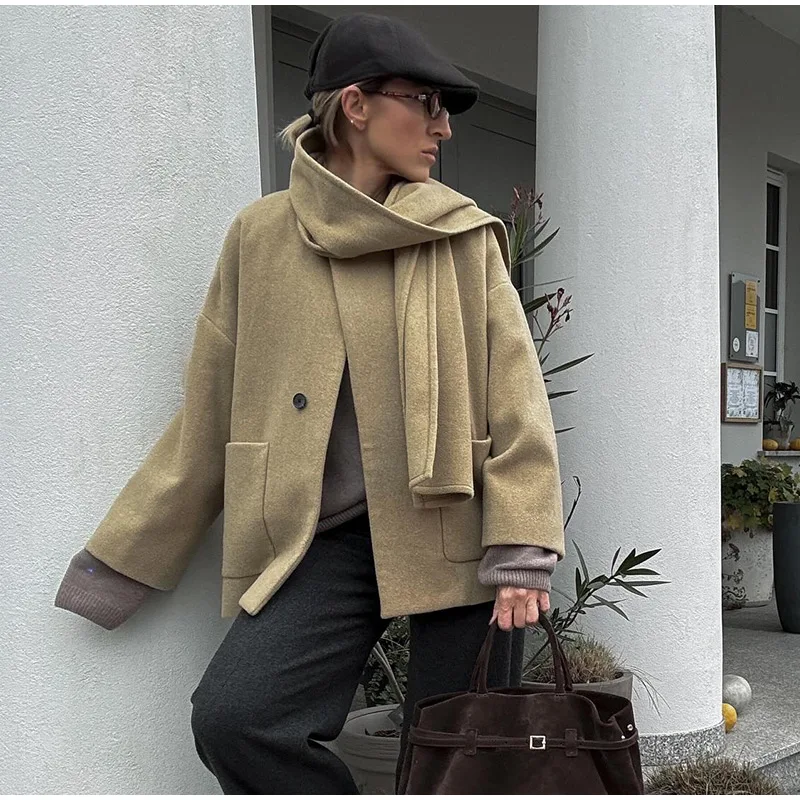 Woolen Scarf Collar Casual Coat Women Single Breasted Elegant Thicken Warm Pocket Loose Solid Jacket Winter Long Sleeve Outwear