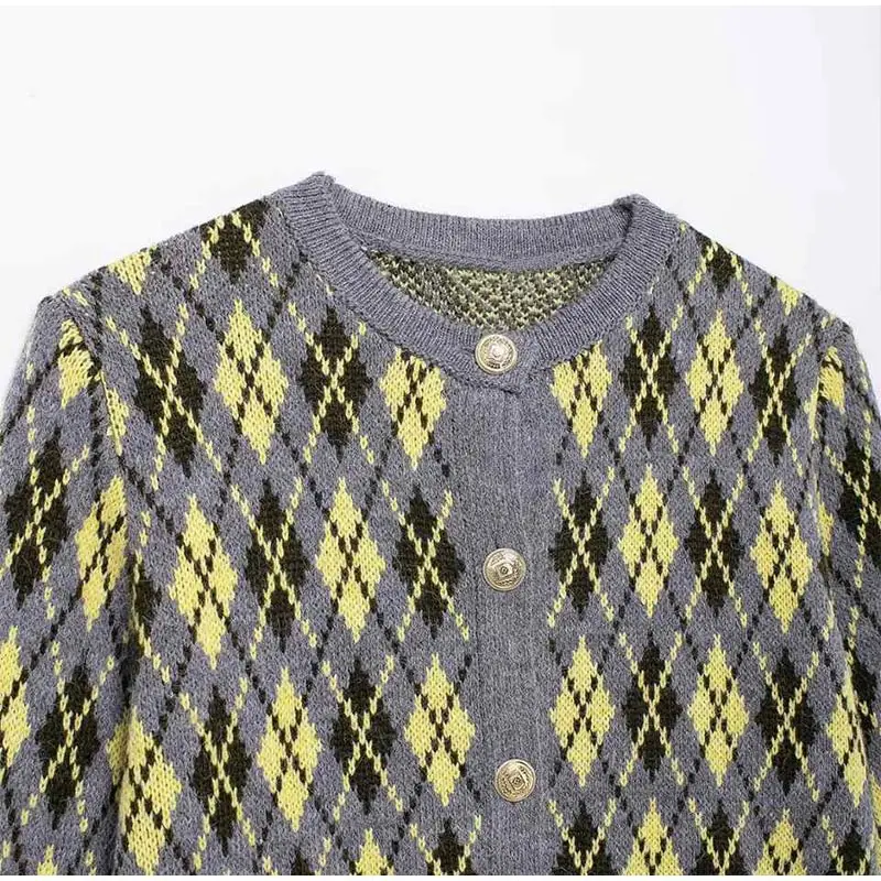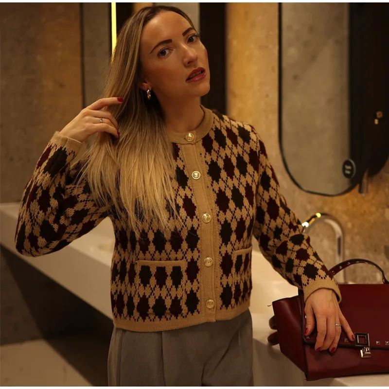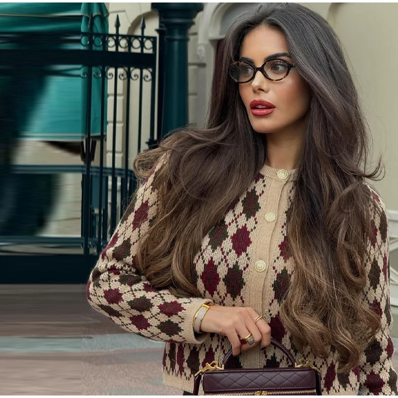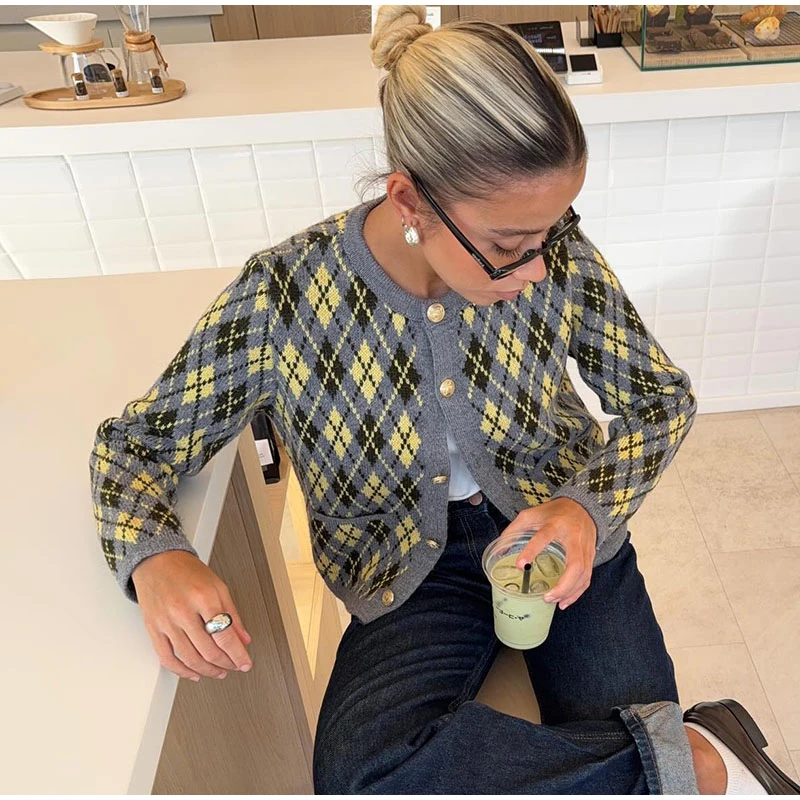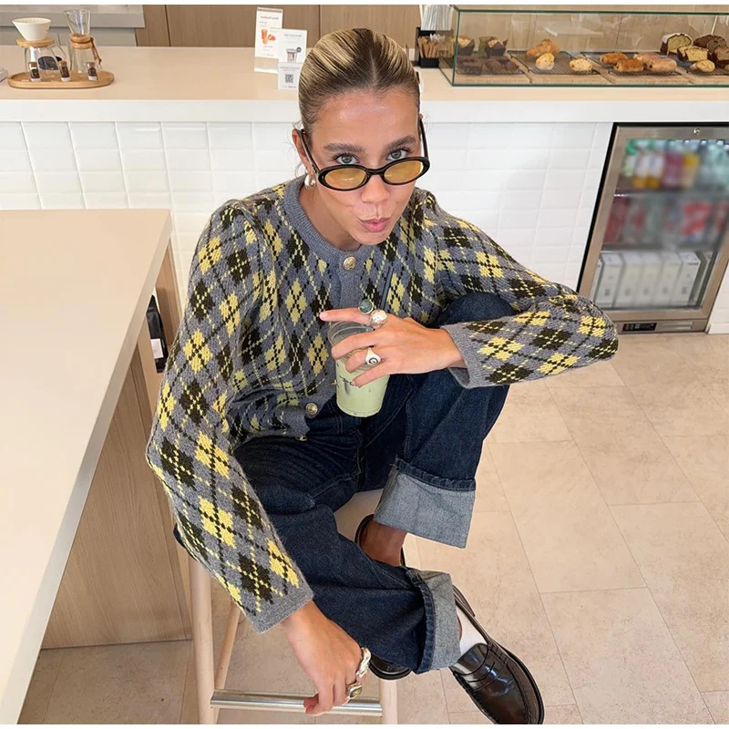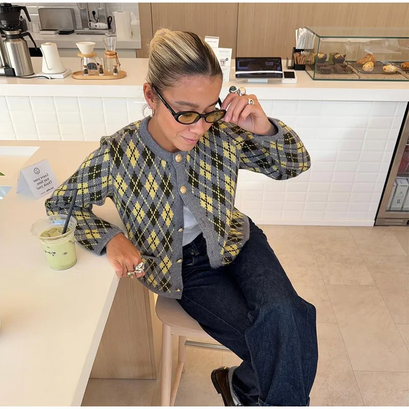 Check Plaid Knitted Cardigans Women Single Breasted Casual Loose Elegant Sweaters Long Sleeve Chic Coats 2024 Winter Lady Tops