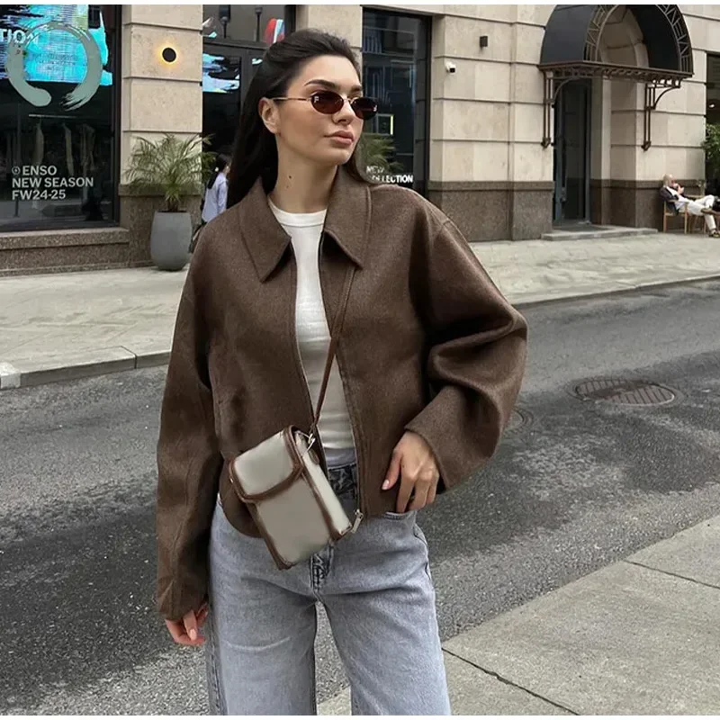 Vintage Solid Lapel Short Jacket Women Loose Long Sleeve Zipper Crop Coats Autumn New Lady Casual High Street Outwears