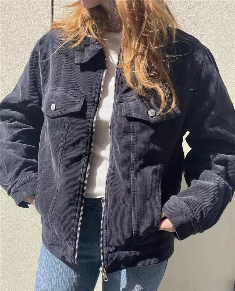 Vintage Loose Pockets Corduroy Jacket Women Autumn Cotton Thick Warm Lapel Zipper Coat Tops Streetwear Vintage Casual Outerwear