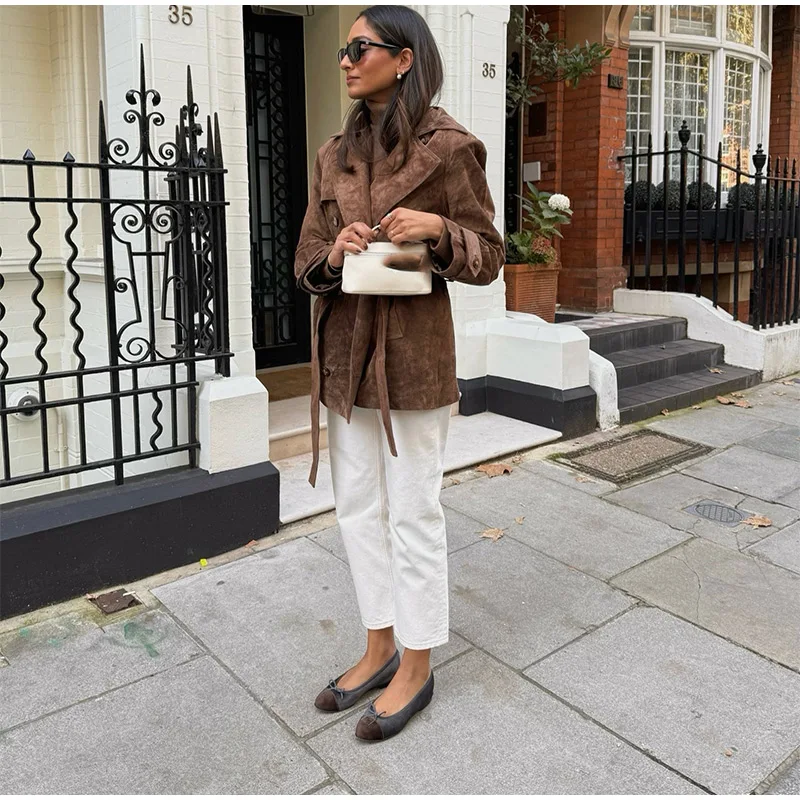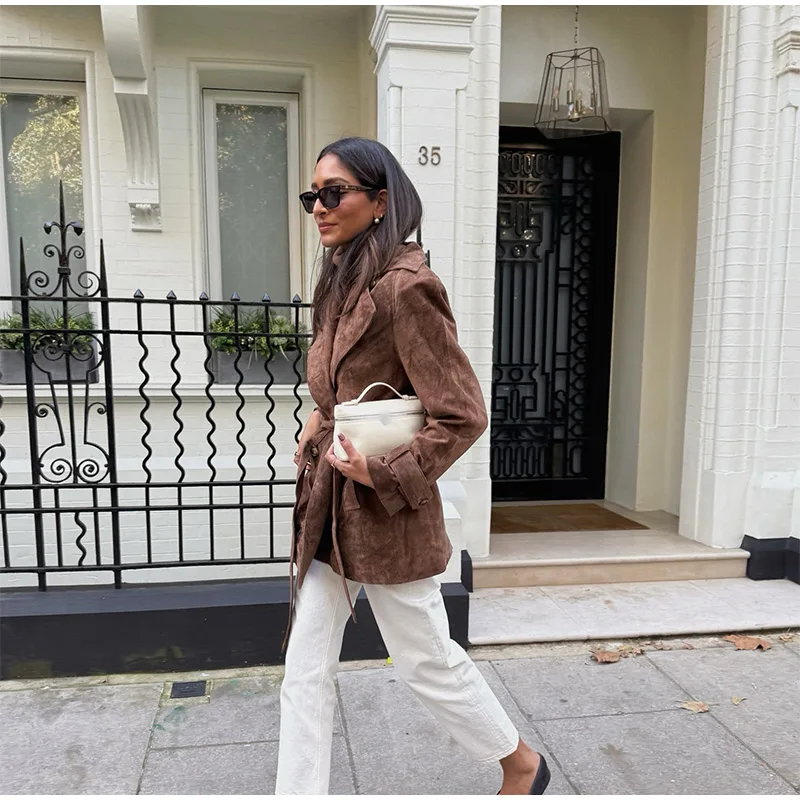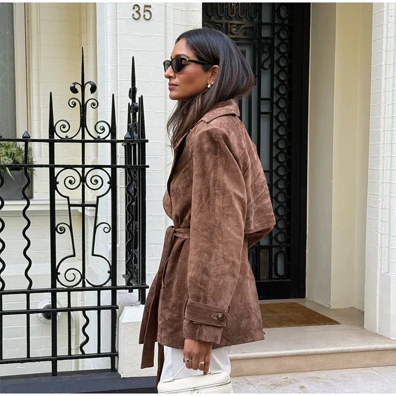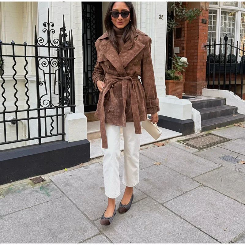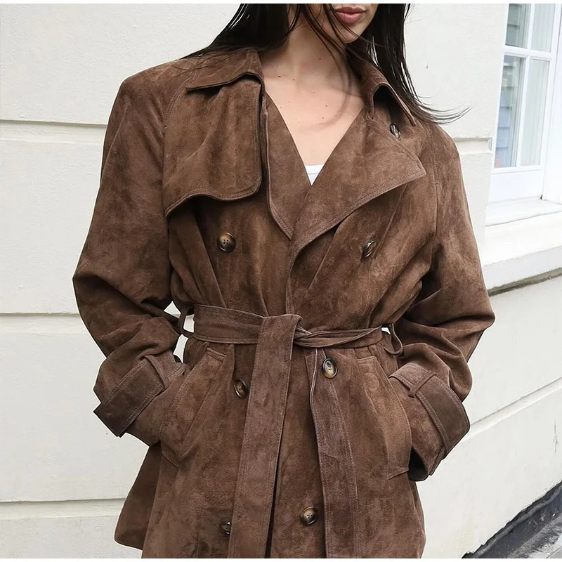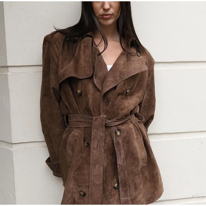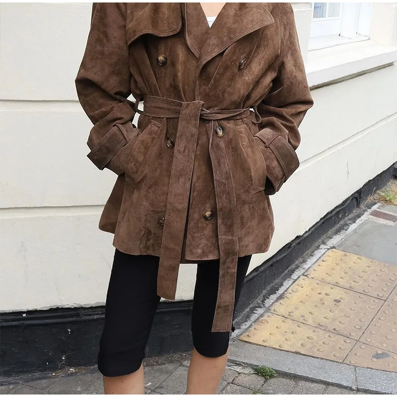 Autumn Fashion Lace Up Lapel Collar Suede Jacket Women Retro Double Breasted Long Sleeve Coat Lady Vintage Chic Windbreaker