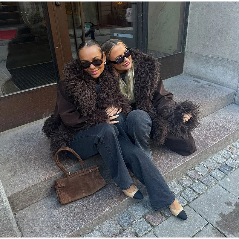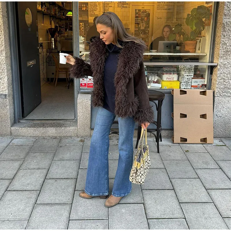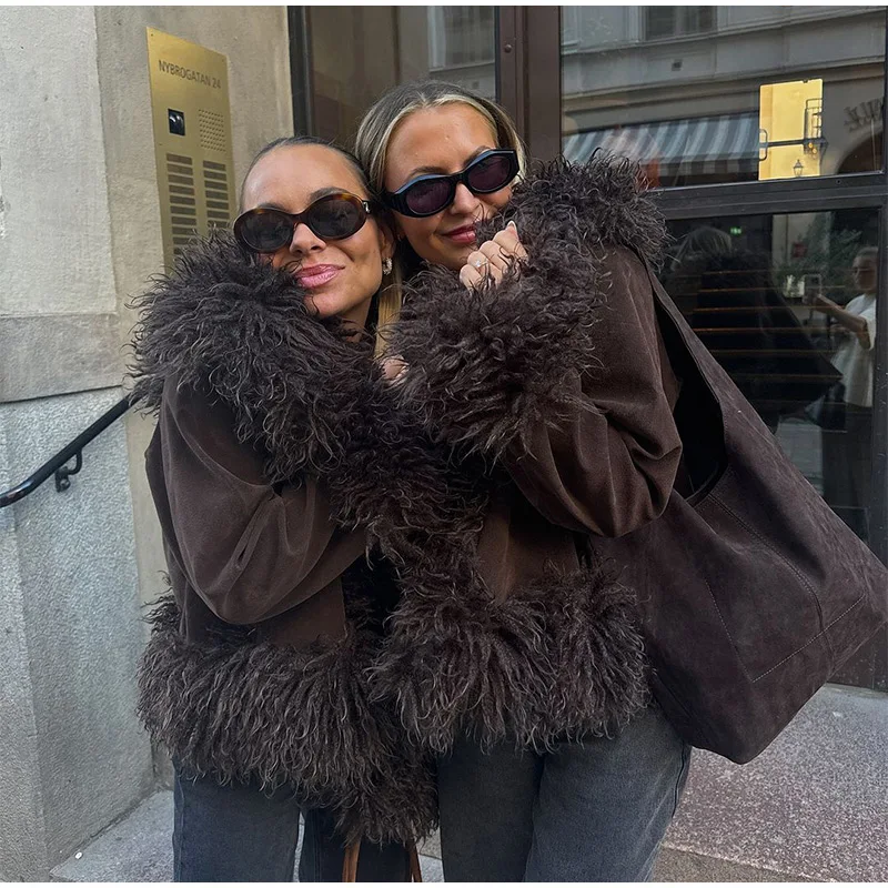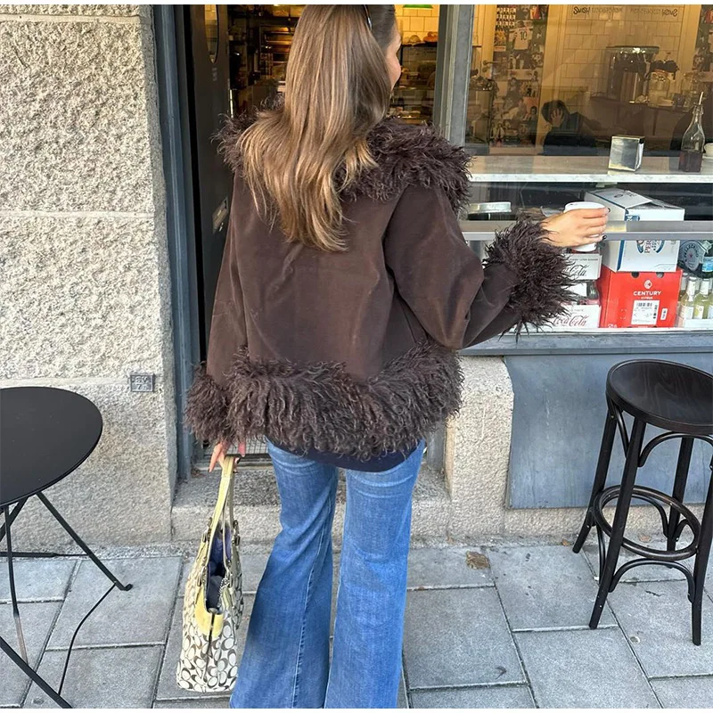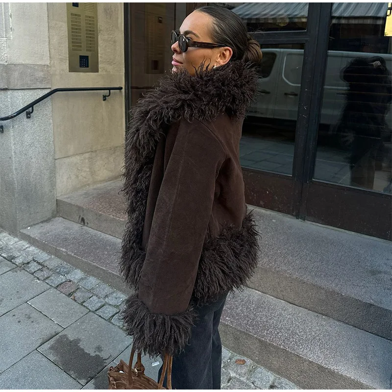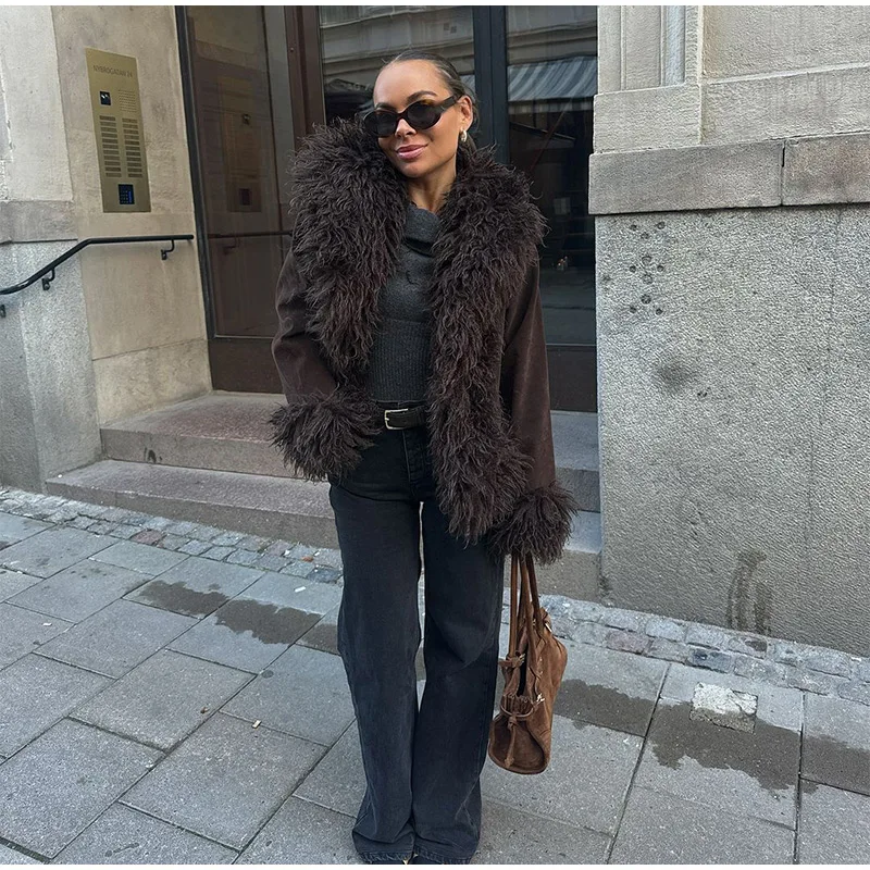 Elegant Coffee Solid Fur Patchwork Cardigan Jacket For Women Fashion Long Sleeve Warm Loose Coats Lady High Streetwear New