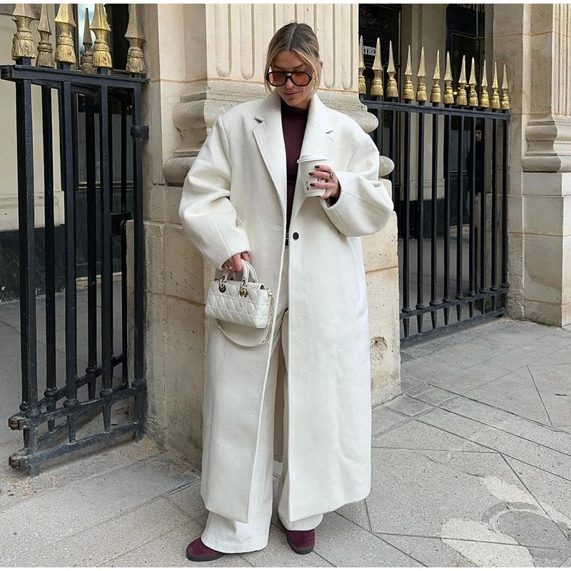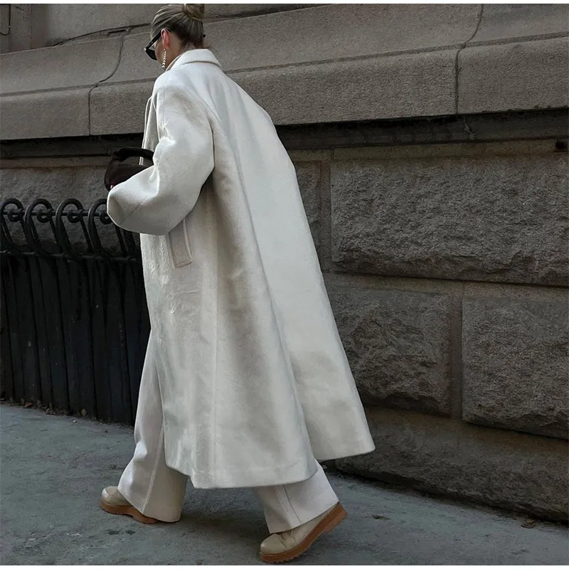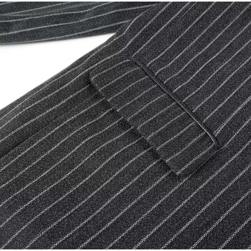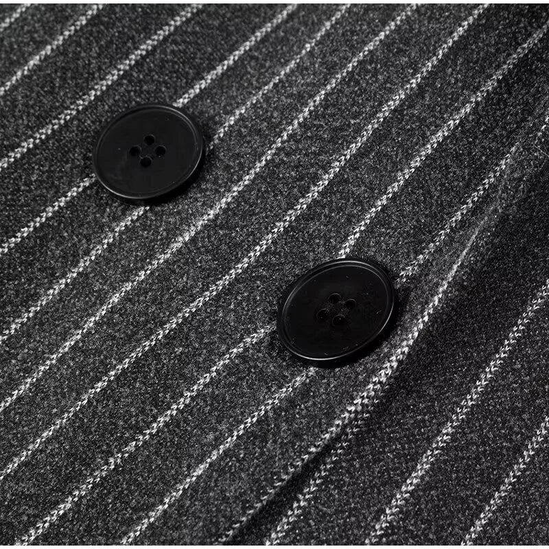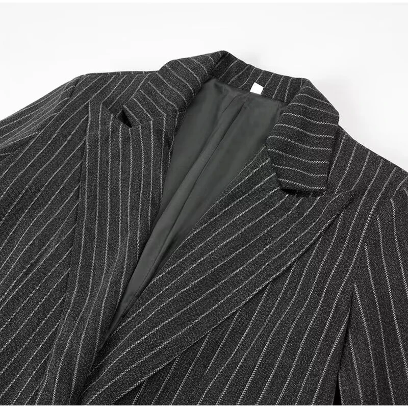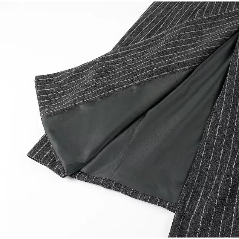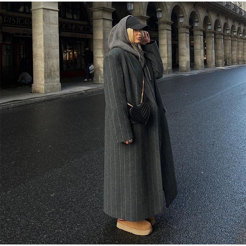Casual Gray Striped Women Long Coats Elegant Woolen Lapel Long Sleeve Back Split Loose Jackets Autumn Chic Street Outwears