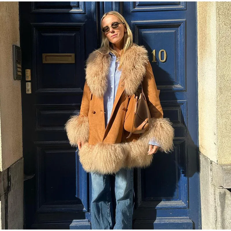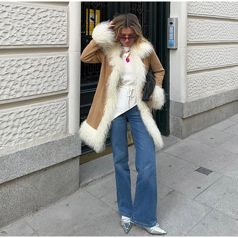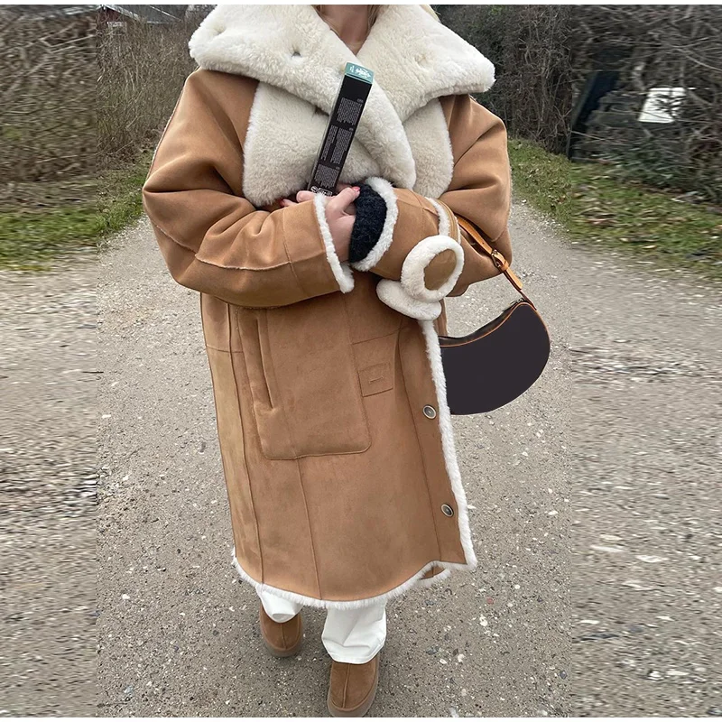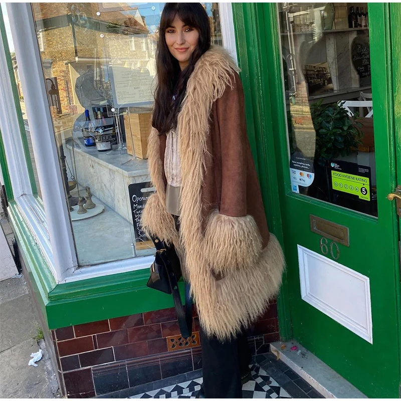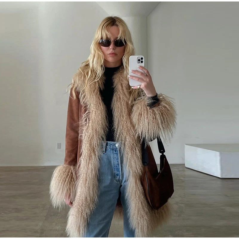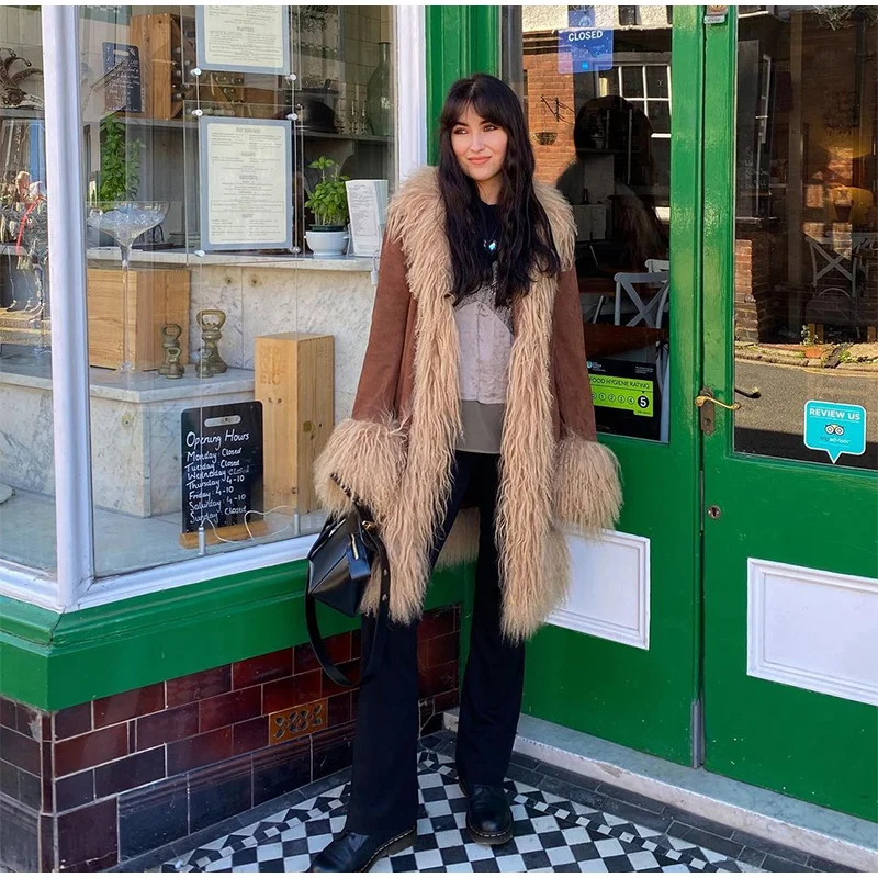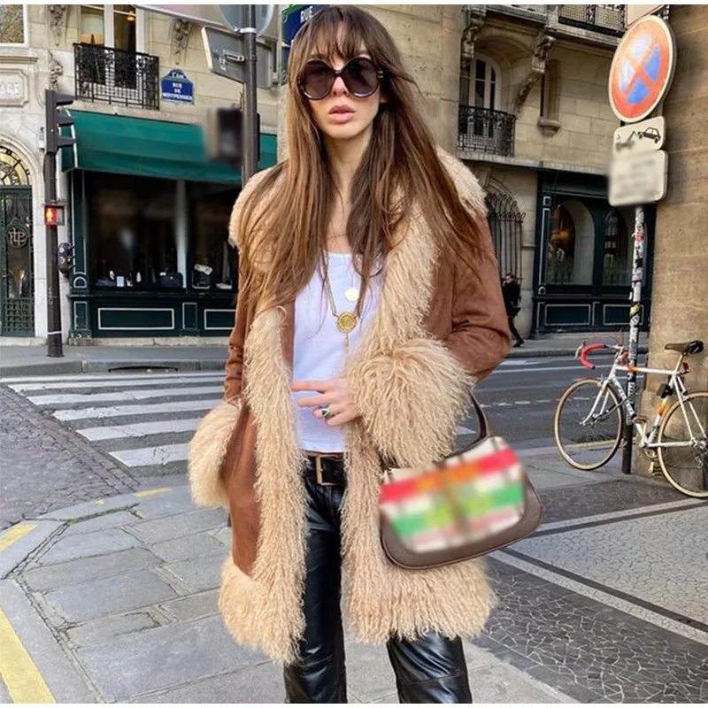 Vintage Furry Faux Fur Women Patchwork Coats Winter Long Sleeve Lapel Female Loose Jacket Casual Pockets Thick Warm Lady Outwear