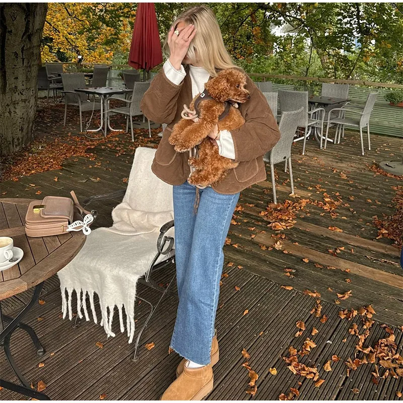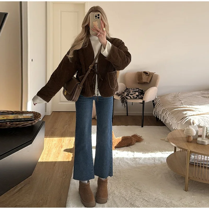 Brown Quilted Padded Suede Coat Women Long Sleeve Lace Up Cropped Jacket Autumn Winter Casual Lightweight New In Outerwears