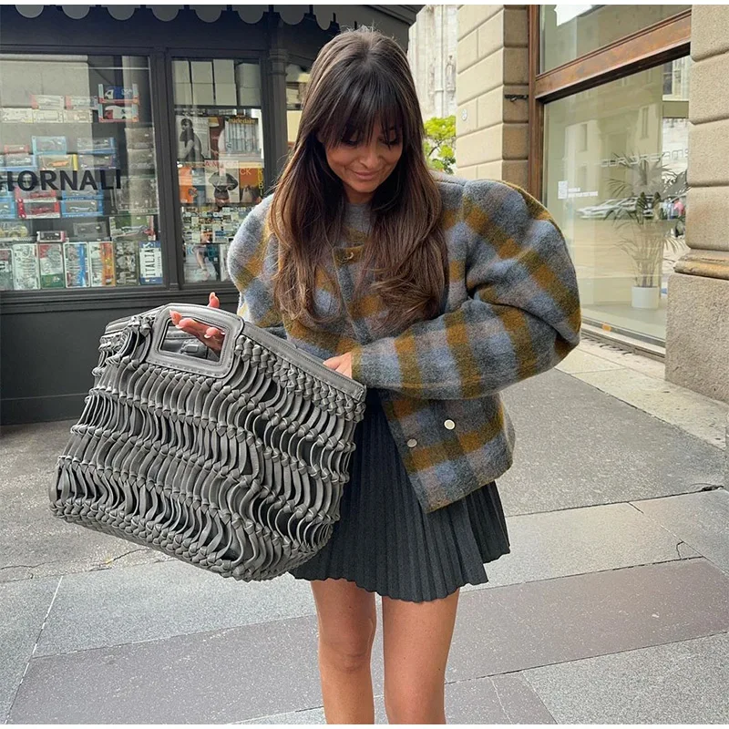 Retro Plaid Puff Sleeve Warm Woolen Women Short Coats Elegant Loose Double Breasted O Neck Jacket Lady Winter Daily Outwear