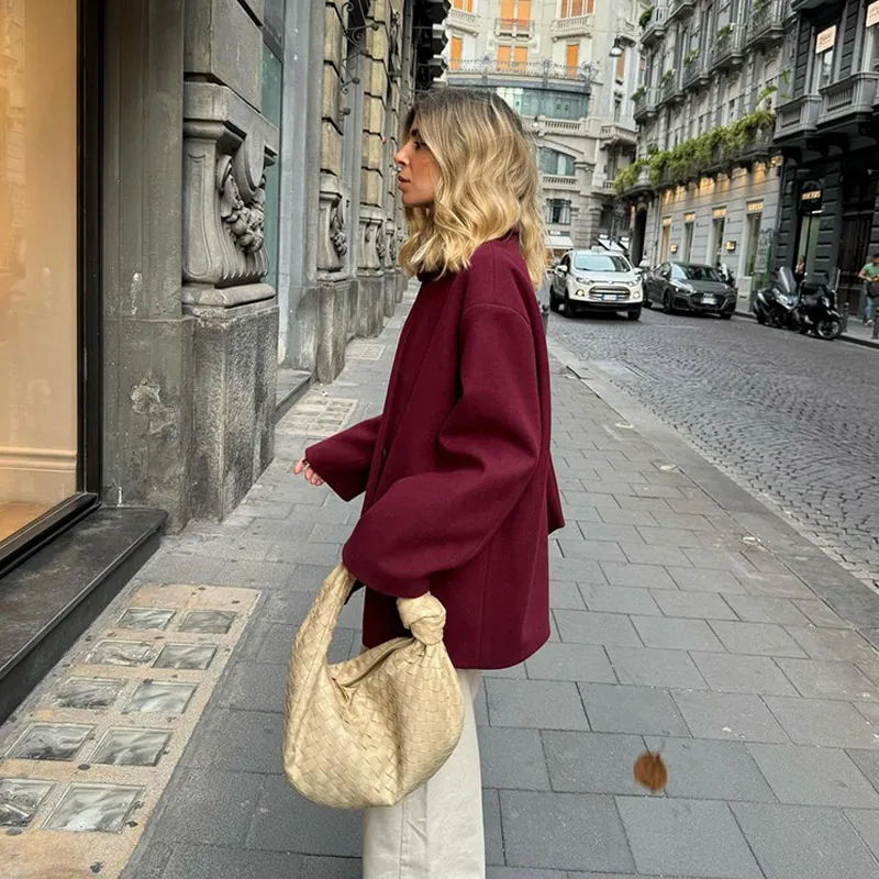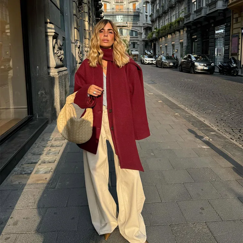 Causal Burgundy Women Autumn Full Sleeve Woolen Coat With Scarf Fashion Solid Single Breasted Jacket Female New Chic Office Wear
