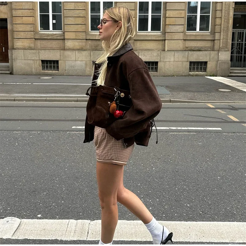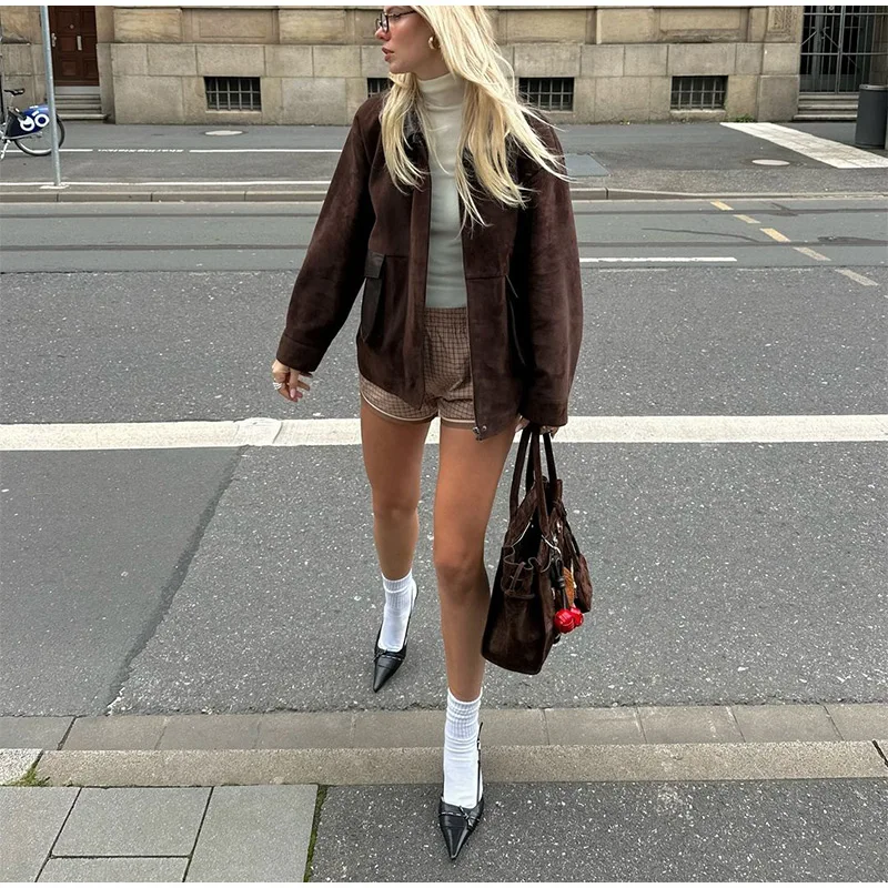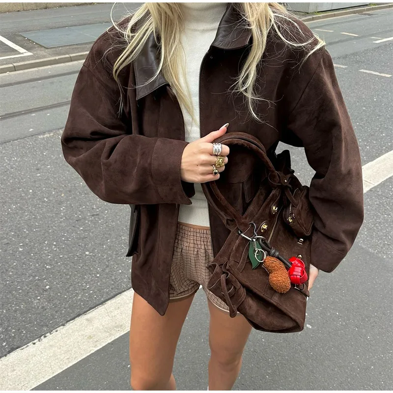 Fashion Lady Lapel Collar Pocket Woolen Short Coats Vintage Long Sleeve Solid Loose Women's Jackets Warm Winter Streetwear