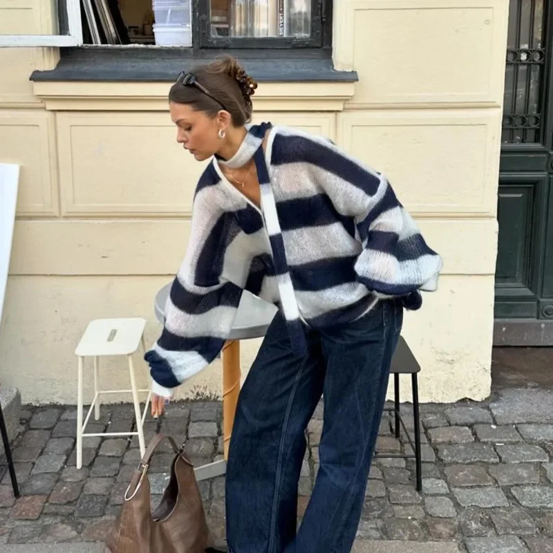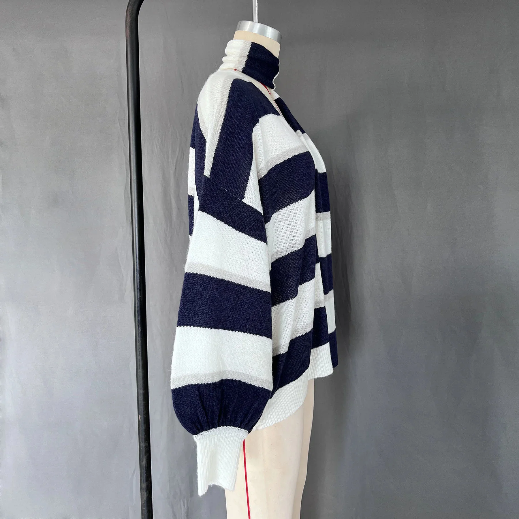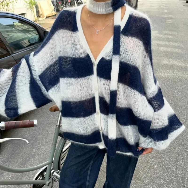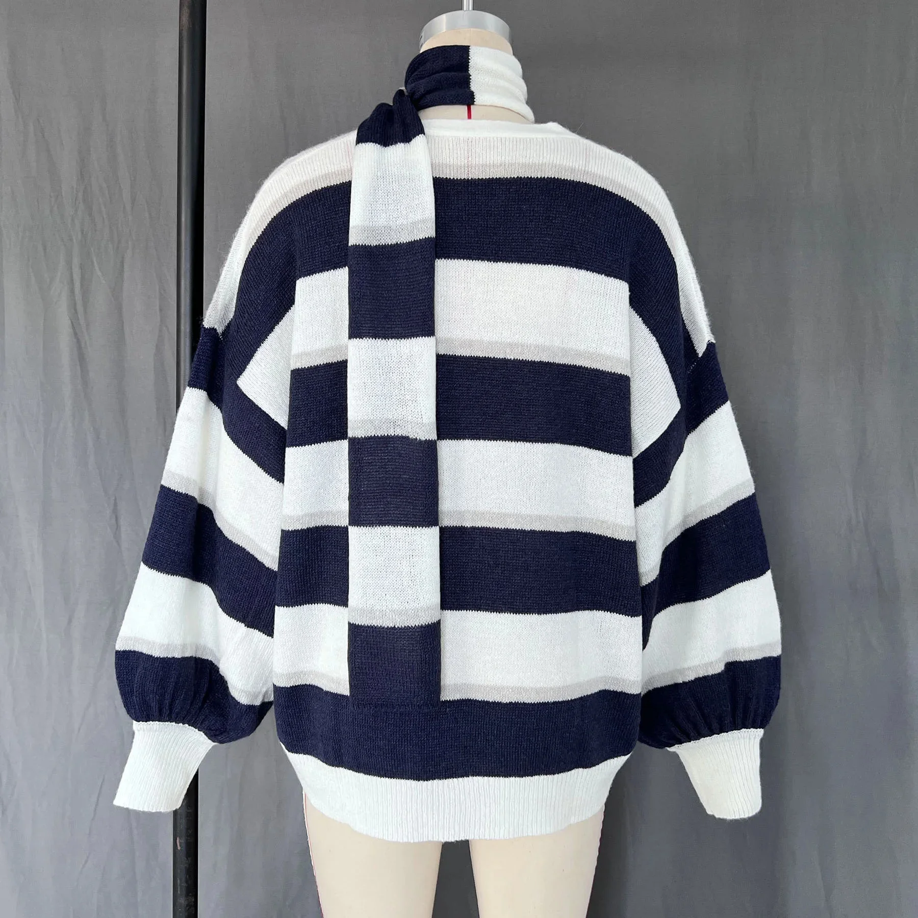 Striped Knit Sweater Cardigan With Scarf Women Casual V Neck Lantern Sleeve Coat Autumn Chic Contrast Lady Fashion Knitwear