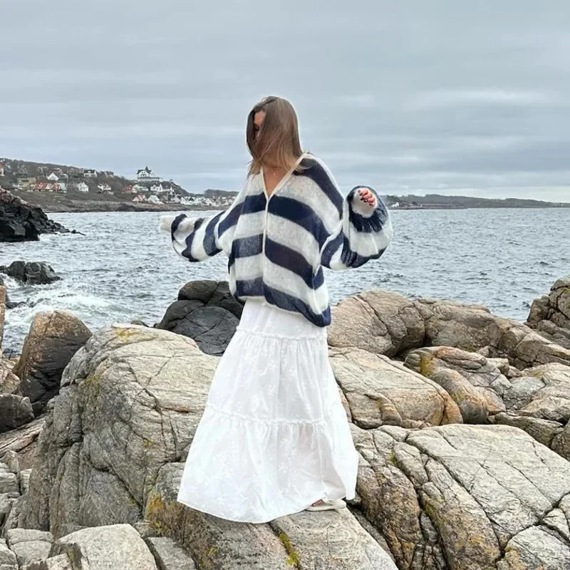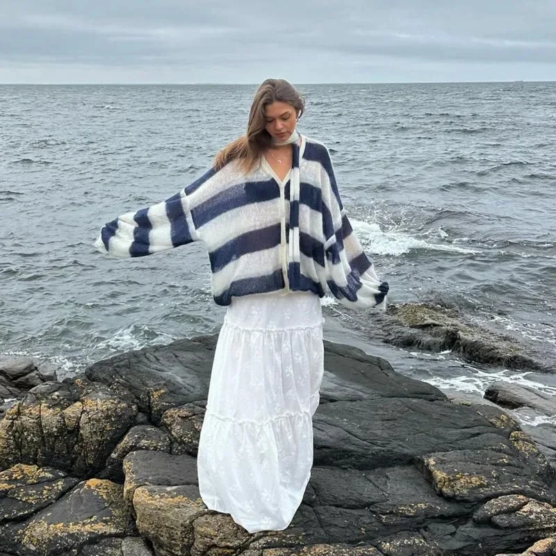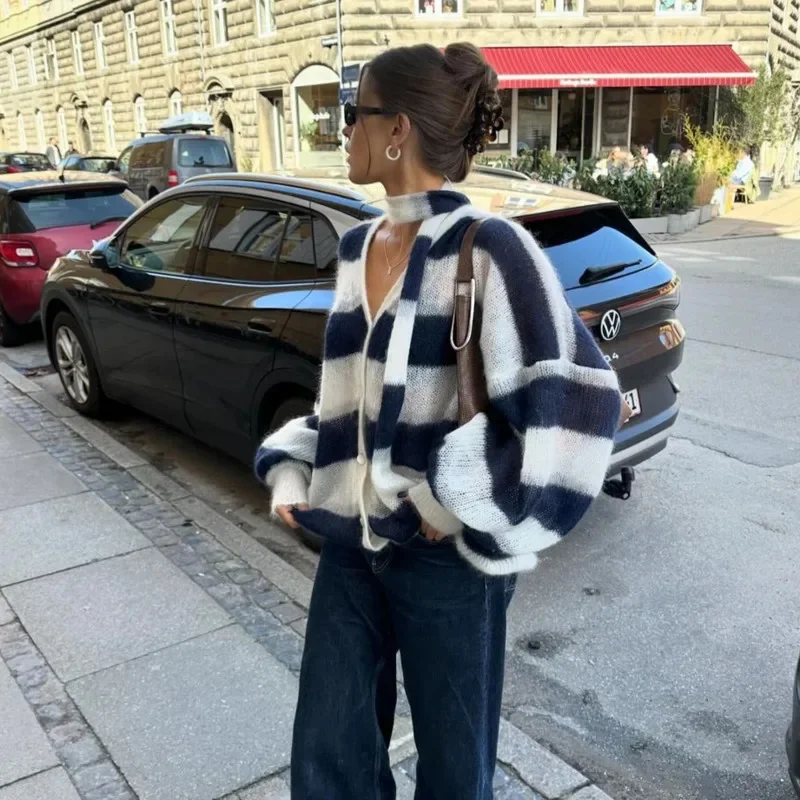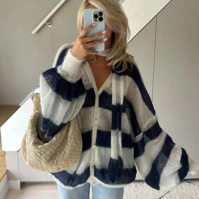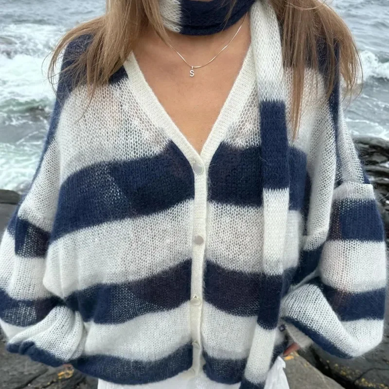 Striped Knit Sweater Cardigan With Scarf Women Casual V Neck Lantern Sleeve Coat Autumn Chic Contrast Lady Fashion Knitwear