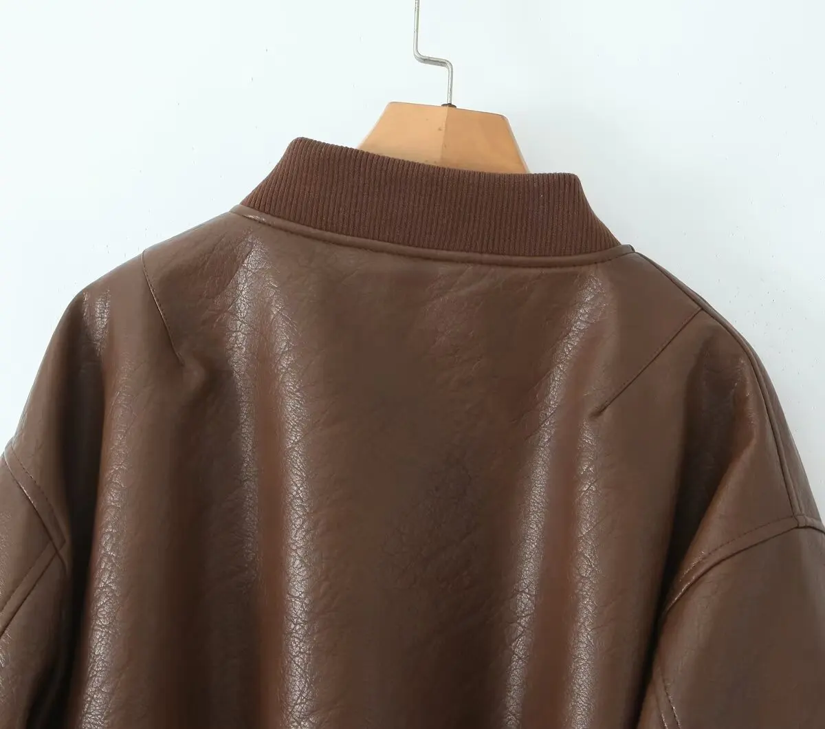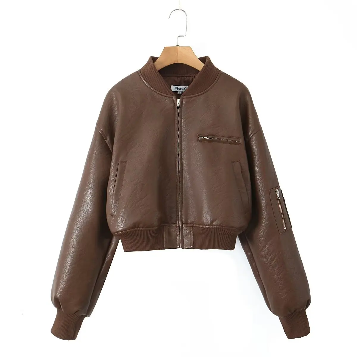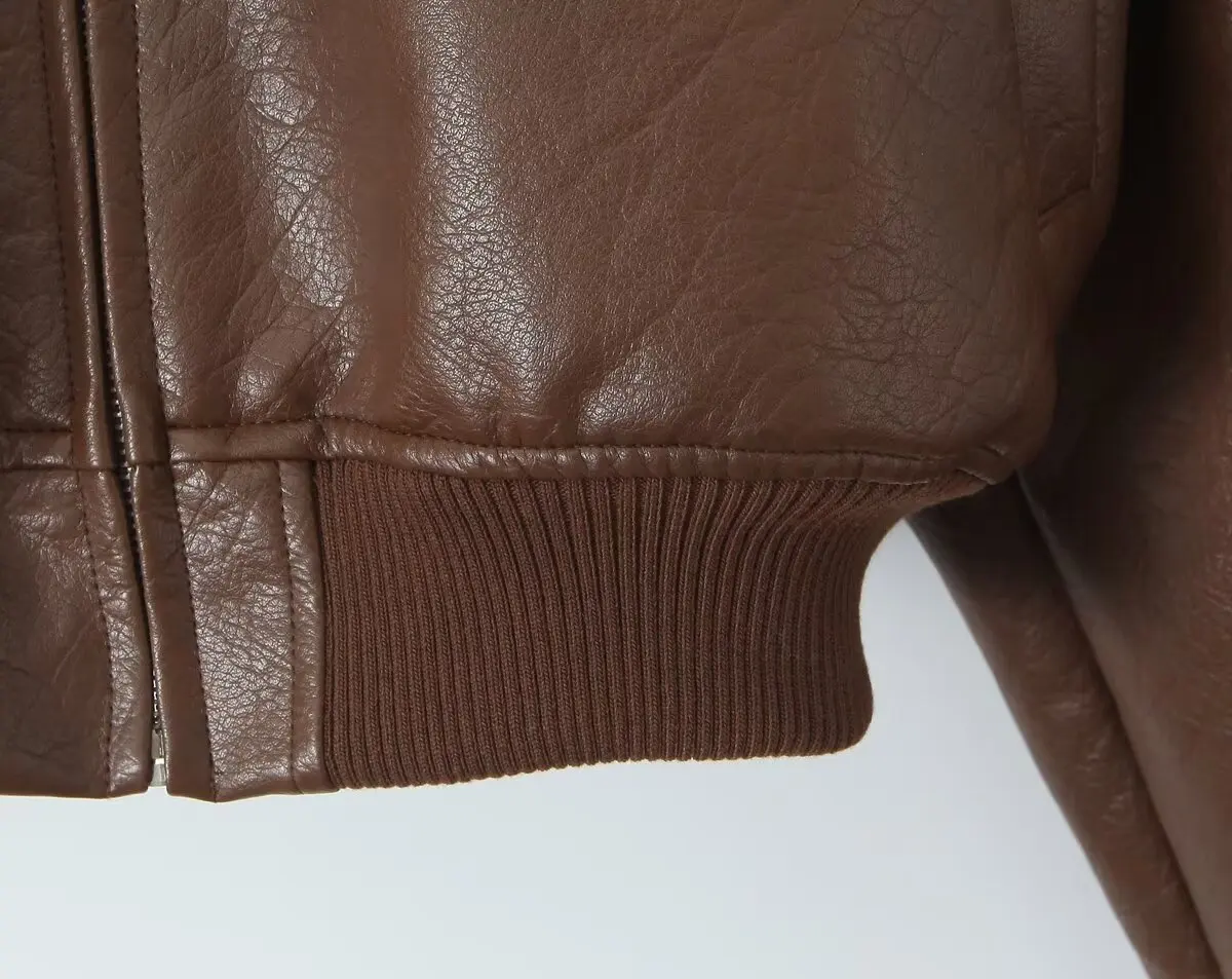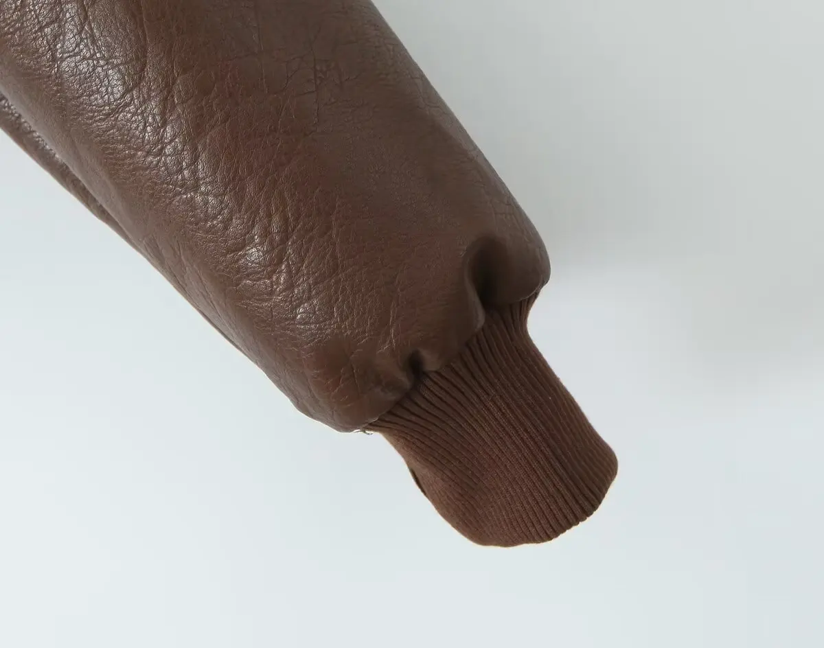American Retro Women Rib V neck PU Leather Jacket Street Full Sleeve Zipper Bomber Quilted Coat High Waist Short Outerwear