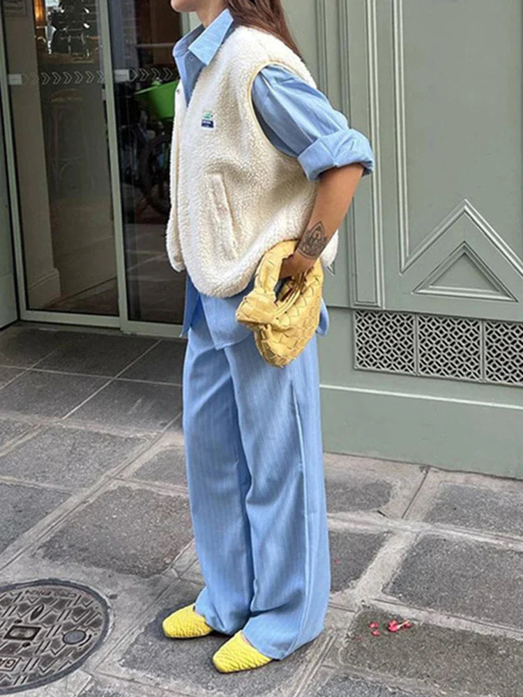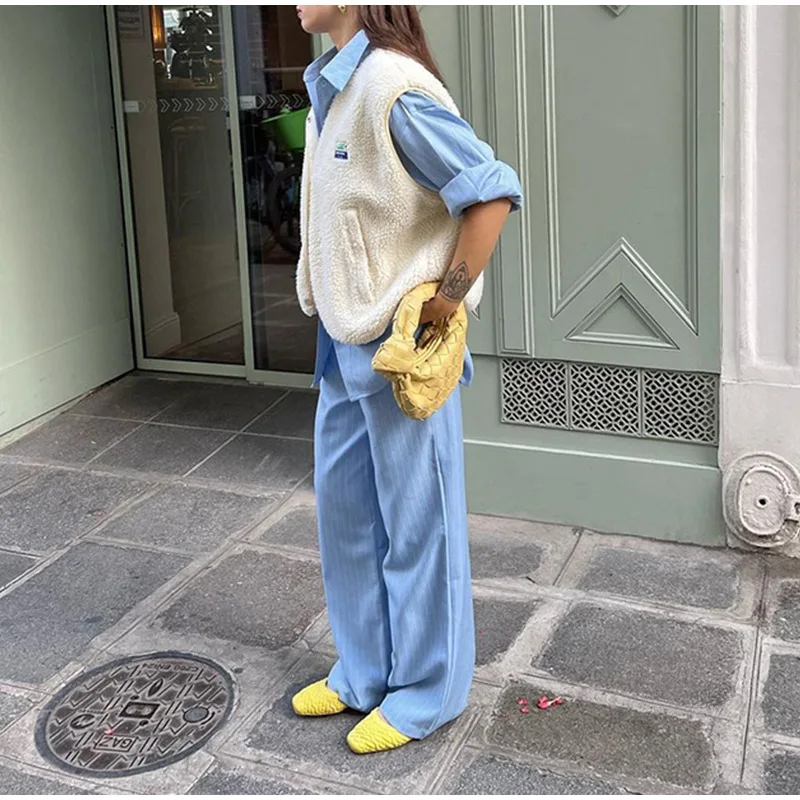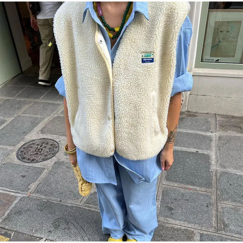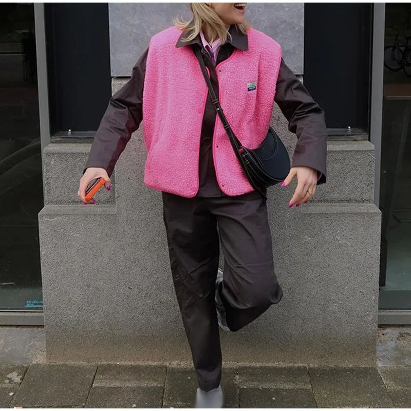 Fashion Lamb Wool Vest Coat For Women V Neck Loose Single Breasted Pocket Waistcoat Warm Autumn 2024 High Street Outwear