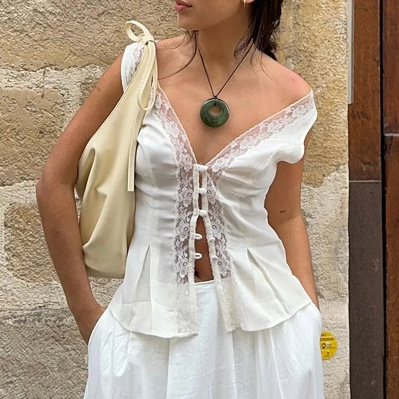 Chic Lace Bow Sleeveless Short Tank Top For Women Deep V Neck Button Sexy Patchwork Female White Cardigan Top Summer New