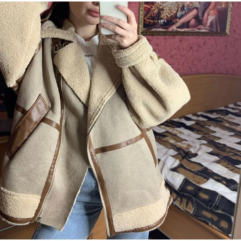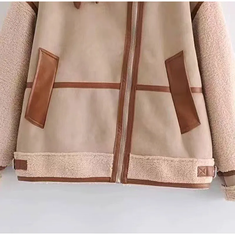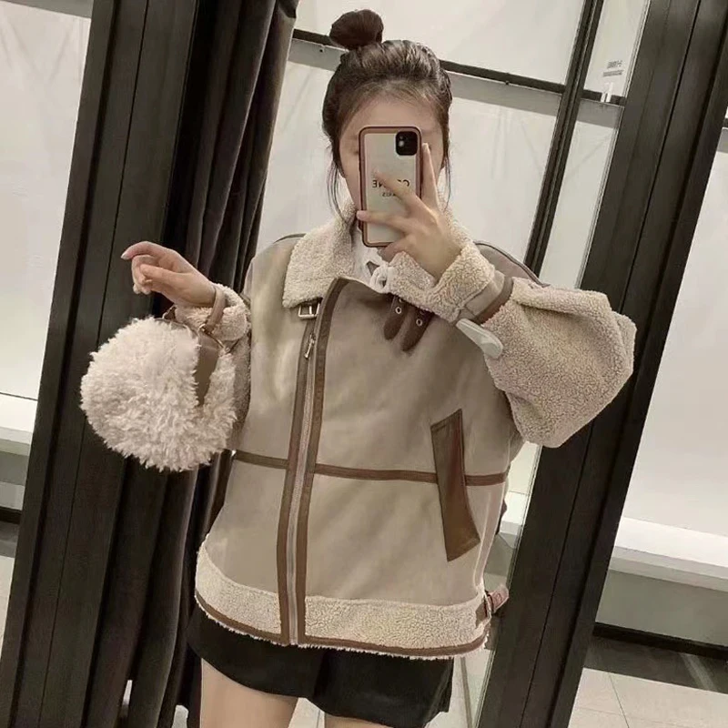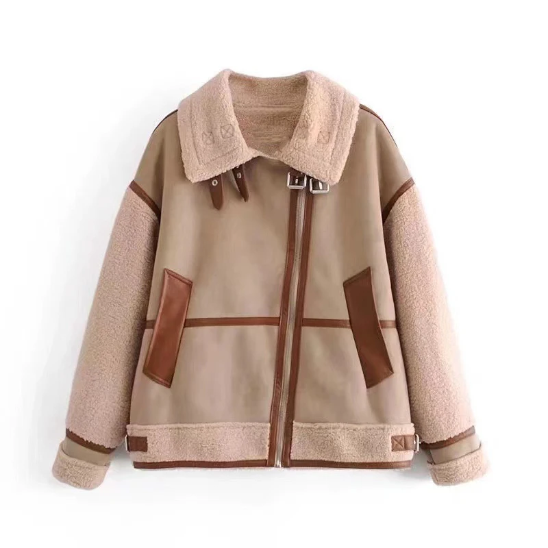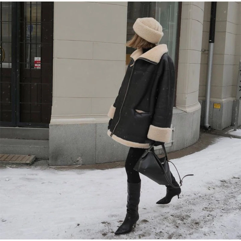 Tavimart Leather Faux Fur Patchwork Thick Women's Moto Coat Lapel Zipper Long Sleeve Pocket Warm Bike Jacket Autumn Chic Streetwears