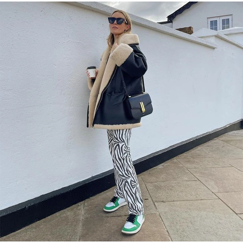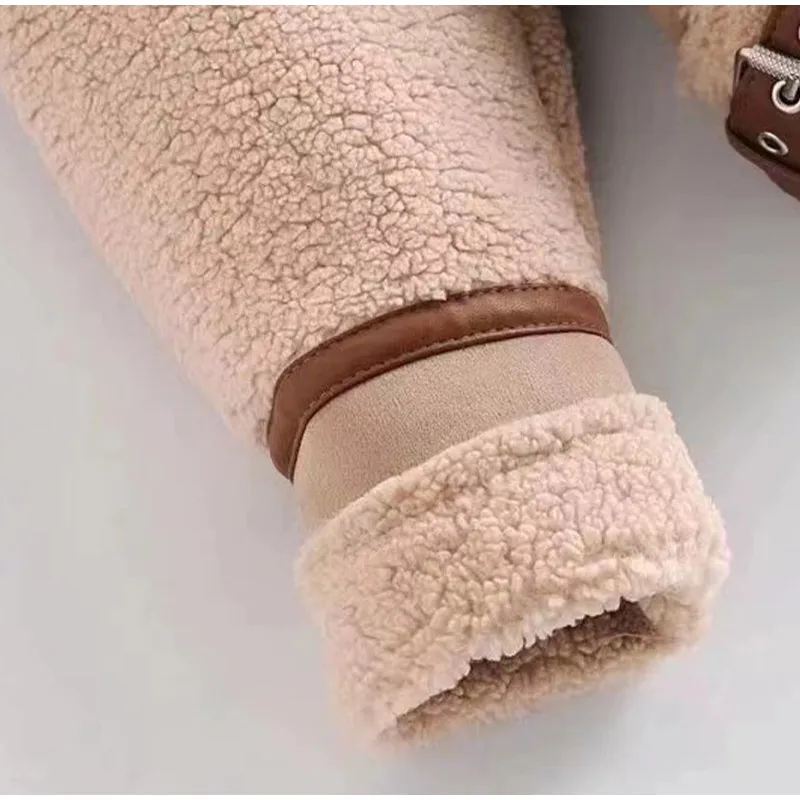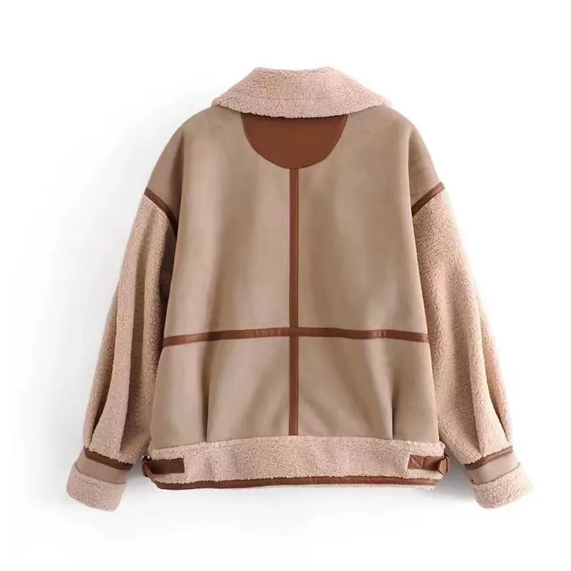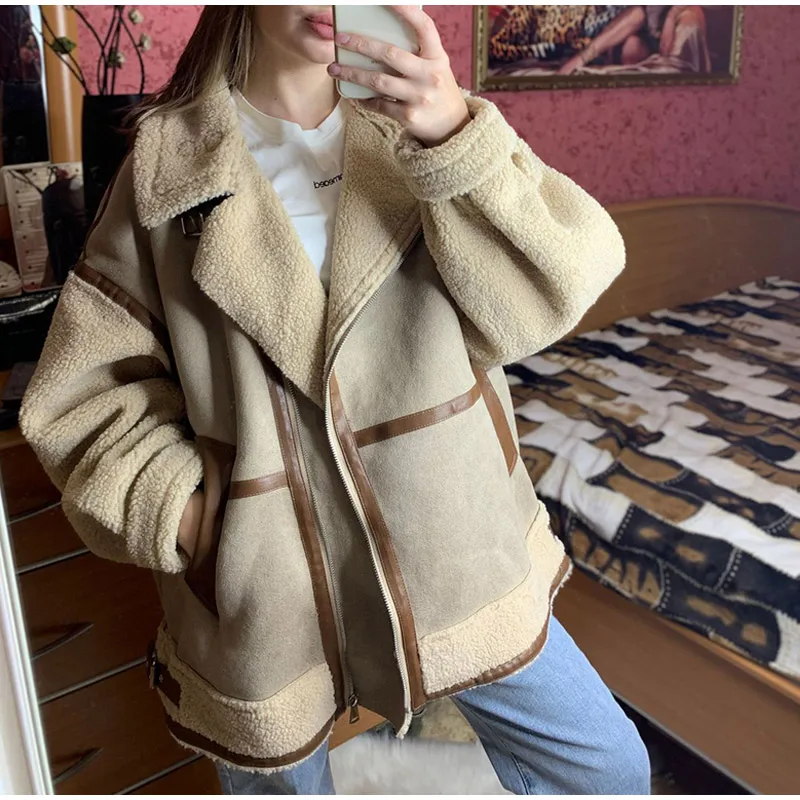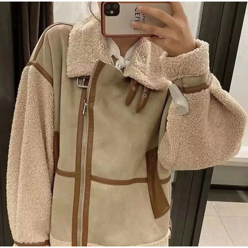 Tavimart Leather Faux Fur Patchwork Thick Women's Moto Coat Lapel Zipper Long Sleeve Pocket Warm Bike Jacket Autumn Chic Streetwears