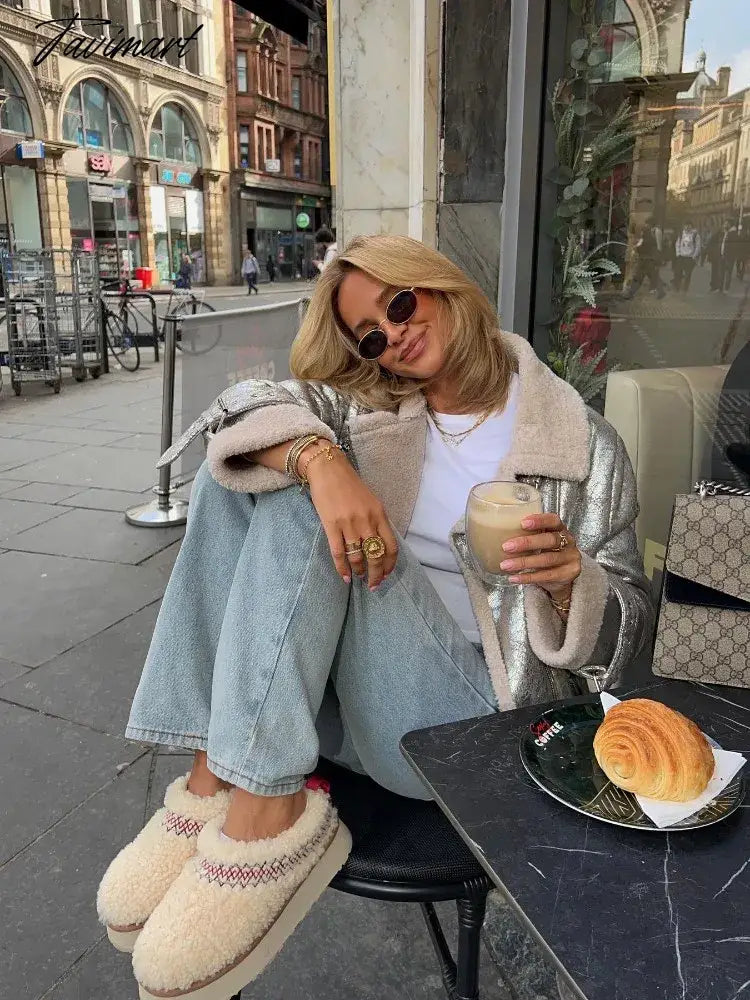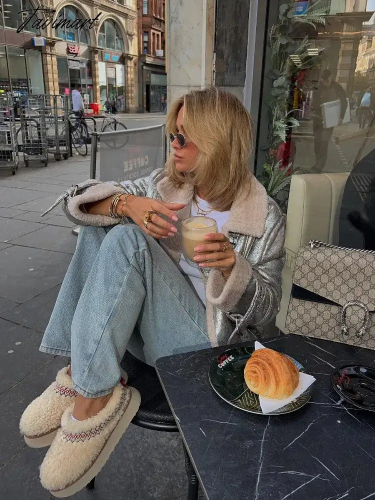 Tavimart Classic Silver Faux Fur Lapel Collar Women's Jackets Fake Sheepskin Leather Warm Thick Coat Winter Jacket Faux Shearling Jacket