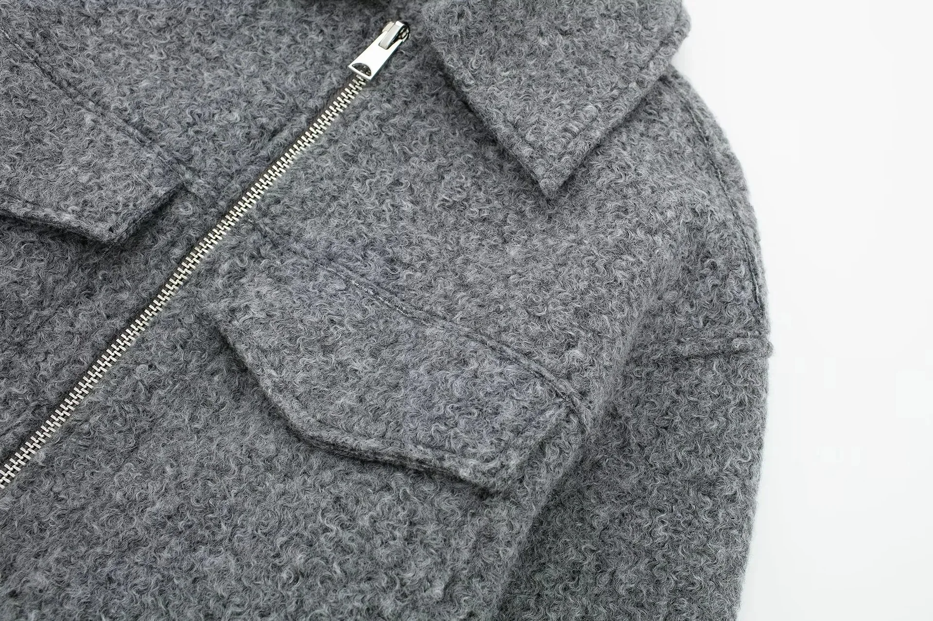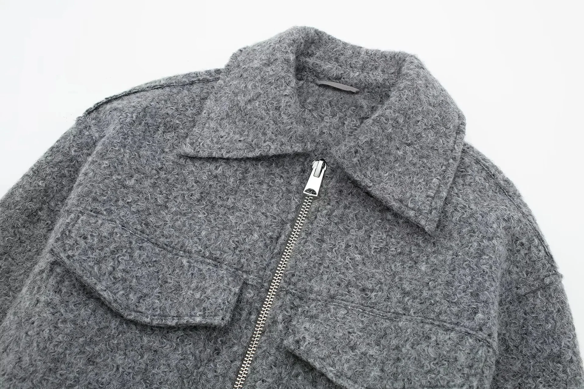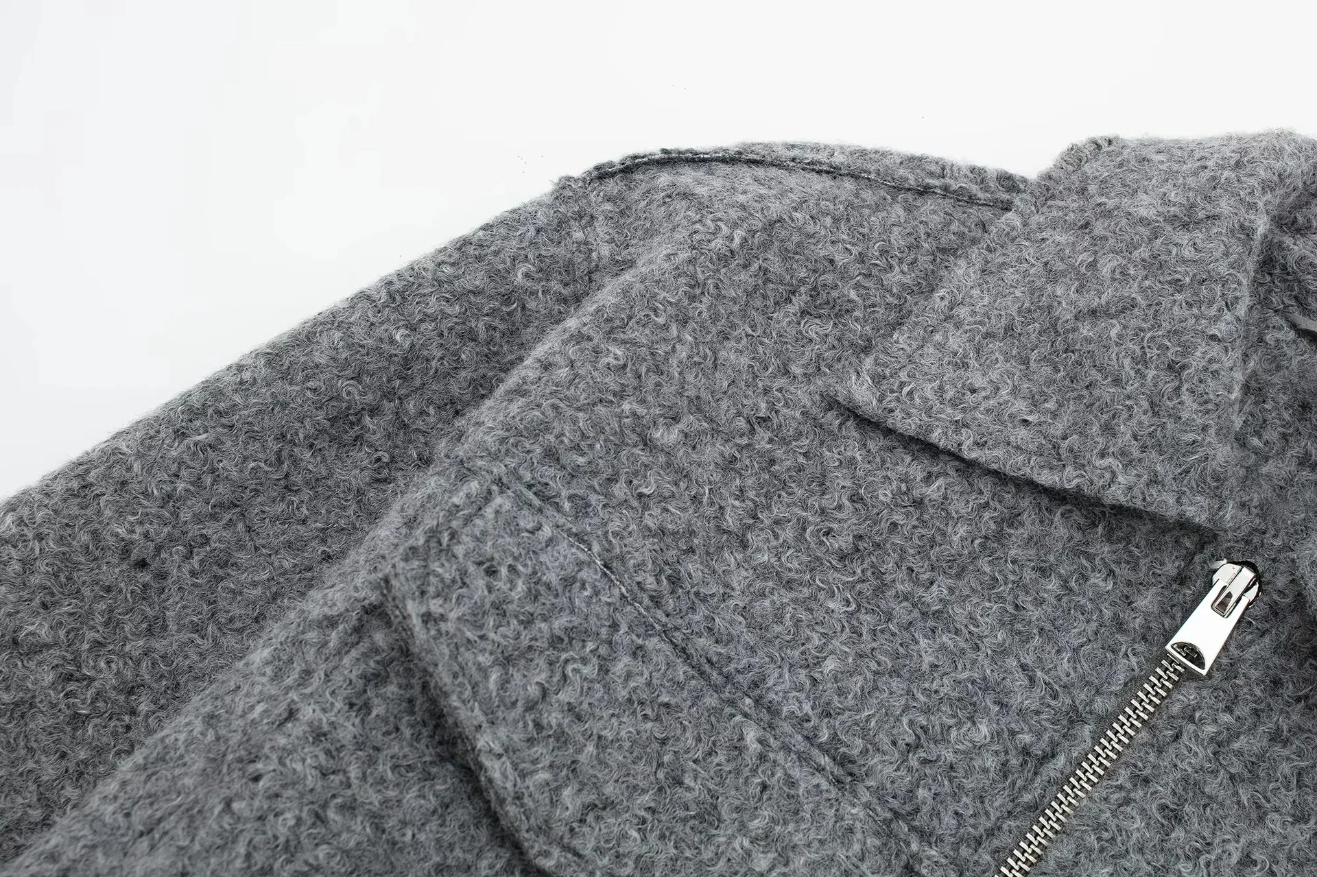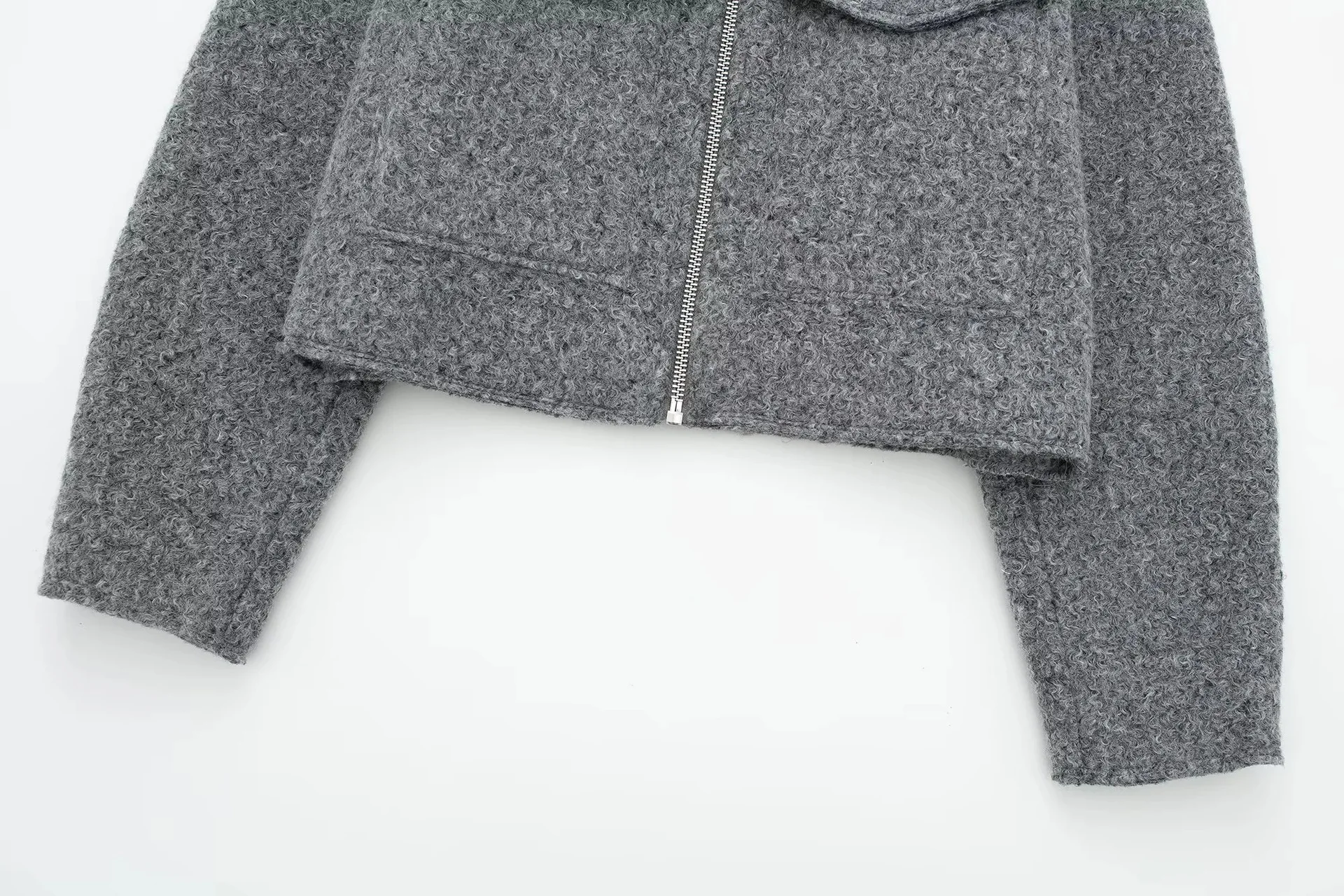 Tavimart Gray Jacket Women Fashion Cropped Coats Autumn Elegant Lapel Zipper Jackets Ladies Casual Wool Blend Outerwear Female Chaquetas