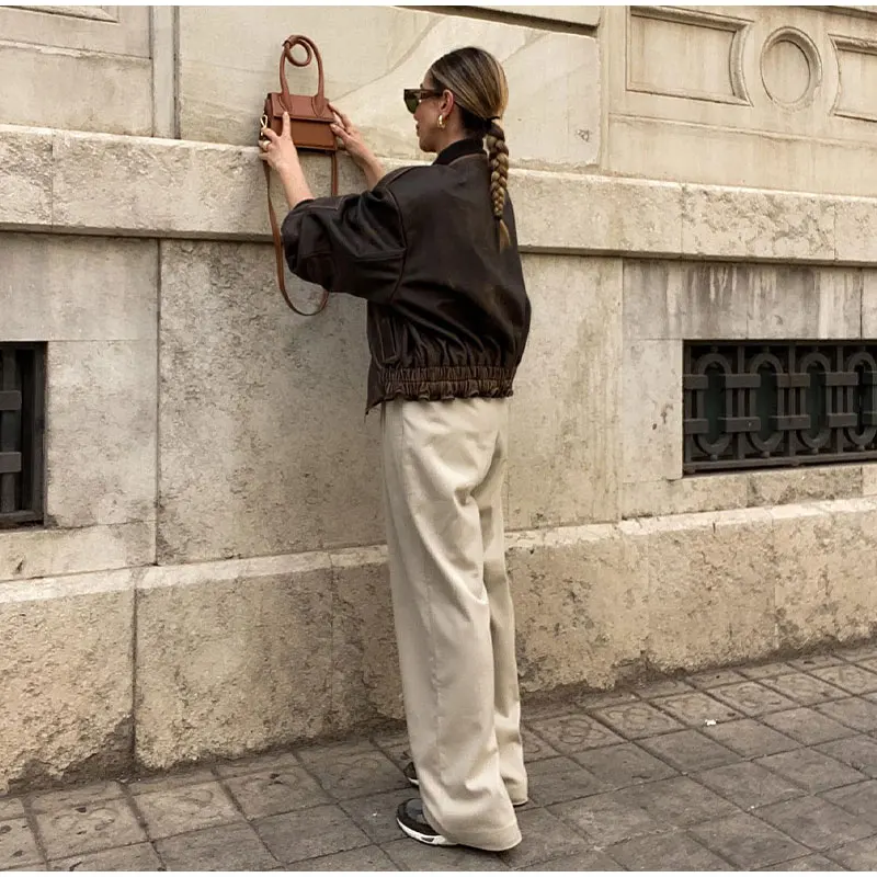 Vintage Zippered Pu Leather Jacket Coat For Women Round Neck Long Sleeved Pocket Coat Autumn Fashion Female Street Outwears